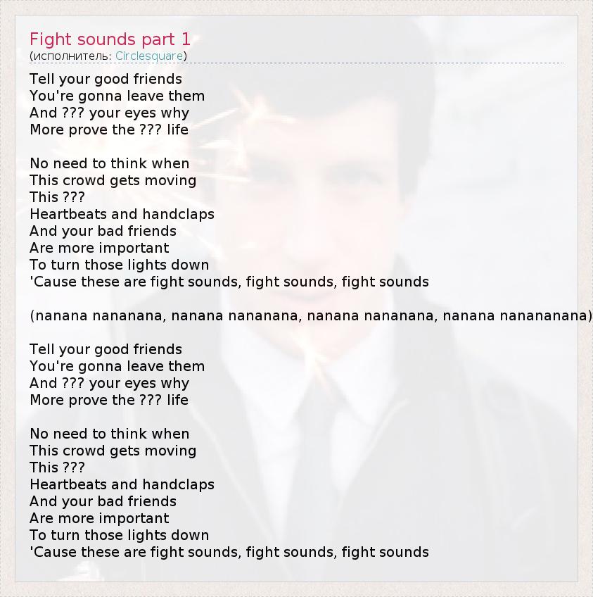 Tell your good friends You're gonna leave them And ??? your eyes why More prove the ??? life No need to think when This crowd gets moving This ??? Heartbeats and handclaps And your bad friends Are more important To turn those lights down 'Cause these are fight sounds, fight sounds, fight sounds (nanana nananana, nanana nananana, nanana nananana, nanana nanananana) Tell your good friends You're gonna leave them And ??? your eyes why More prove the ??? life No need to think when This crowd gets moving This ??? Heartbeats and handclaps And your bad friends Are more important To turn those lights down 'Cause these are fight sounds, fight sounds, fight sounds