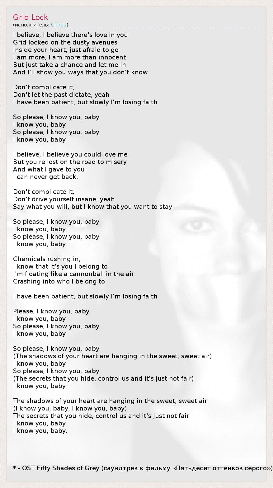 I believe, I believe there's love in you Grid locked on the dusty avenues Inside your heart, just afraid to go I am more, I am more than innocent But just take a chance and let me in And I'll show you ways that you don't know Don't complicate it, Don't let the past dictate, yeah I have been patient, but slowly I'm losing faith So please, I know you, baby I know you, baby So please, I know you, baby I know you, baby I believe, I believe you could love me But you're lost on the road to misery And what I gave to you I can never get back. Don't complicate it, Don't drive yourself insane, yeah Say what you will, but I know that you want to stay So please, I know you, baby I know you, baby So please, I know you, baby I know you, baby Chemicals rushing in, I know that it's you I belong to I'm floating like a cannonball in the air Crashing into who I belong to I have been patient, but slowly I'm losing faith Please, I know you, baby I know you, baby So please, I know you, baby I know you, baby So please, I know you, baby (The shadows of your heart are hanging in the sweet, sweet air) I know you, baby So please, I know you, baby (The secrets that you hide, control us and it's just not fair) I know you, baby The shadows of your heart are hanging in the sweet, sweet air (I know you, baby, I know you, baby) The secrets that you hide, control us and it's just not fair I know you, baby I know you, baby. * - OST Fifty Shades of Grey (cаундтрек к фильму «Пятьдесят оттенков серого»)