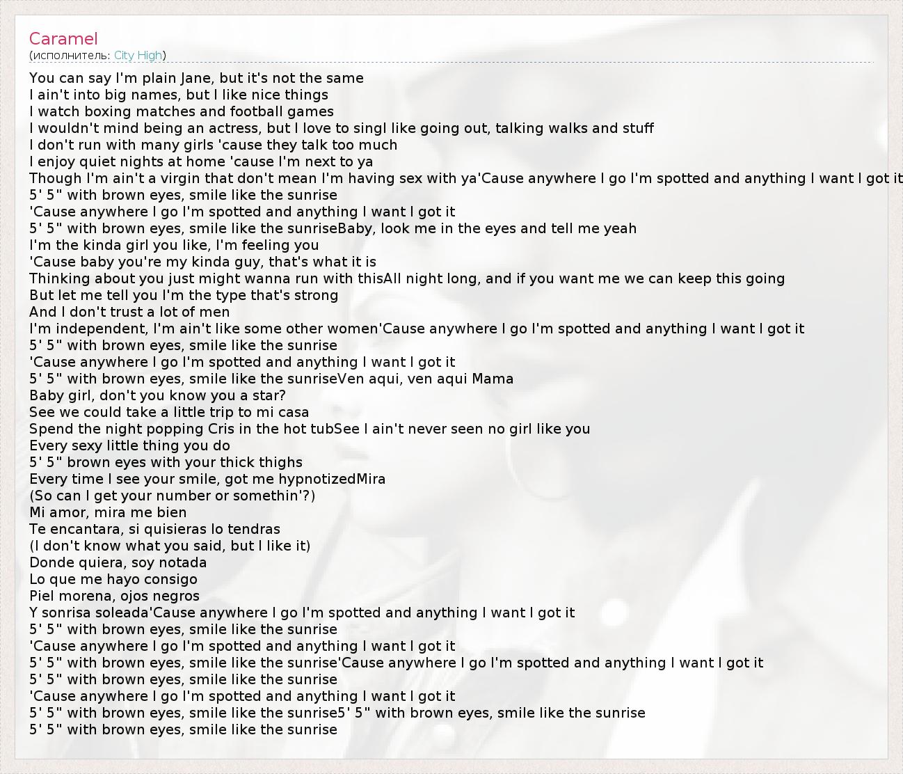 You can say I'm plain Jane, but it's not the same I ain't into big names, but I like nice things I watch boxing matches and football games I wouldn't mind being an actress, but I love to singI like going out, talking walks and stuff I don't run with many girls 'cause they talk too much I enjoy quiet nights at home 'cause I'm next to ya Though I'm ain't a virgin that don't mean I'm having sex with ya'Cause anywhere I go I'm spotted and anything I want I got it 5' 5" with brown eyes, smile like the sunrise 'Cause anywhere I go I'm spotted and anything I want I got it 5' 5" with brown eyes, smile like the sunriseBaby, look me in the eyes and tell me yeah I'm the kinda girl you like, I'm feeling you 'Cause baby you're my kinda guy, that's what it is Thinking about you just might wanna run with thisAll night long, and if you want me we can keep this going But let me tell you I'm the type that's strong And I don't trust a lot of men I'm independent, I'm ain't like some other women'Cause anywhere I go I'm spotted and anything I want I got it 5' 5" with brown eyes, smile like the sunrise 'Cause anywhere I go I'm spotted and anything I want I got it 5' 5" with brown eyes, smile like the sunriseVen aqui, ven aqui Mama Baby girl, don't you know you a star? See we could take a little trip to mi casa Spend the night popping Cris in the hot tubSee I ain't never seen no girl like you Every sexy little thing you do 5' 5" brown eyes with your thick thighs Every time I see your smile, got me hypnotizedMira (So can I get your number or somethin'?) Mi amor, mira me bien Te encantara, si quisieras lo tendras (I don't know what you said, but I like it) Donde quiera, soy notada Lo que me hayo consigo Piel morena, ojos negros Y sonrisa soleada'Cause anywhere I go I'm spotted and anything I want I got it 5' 5" with brown eyes, smile like the sunrise 'Cause anywhere I go I'm spotted and anything I want I got it 5' 5" with brown eyes, smile like the sunrise'Cause anywhere I go I'm spotted and anything I want I got it 5' 5" with brown eyes, smile like the sunrise 'Cause anywhere I go I'm spotted and anything I want I got it 5' 5" with brown eyes, smile like the sunrise5' 5" with brown eyes, smile like the sunrise 5' 5" with brown eyes, smile like the sunrise