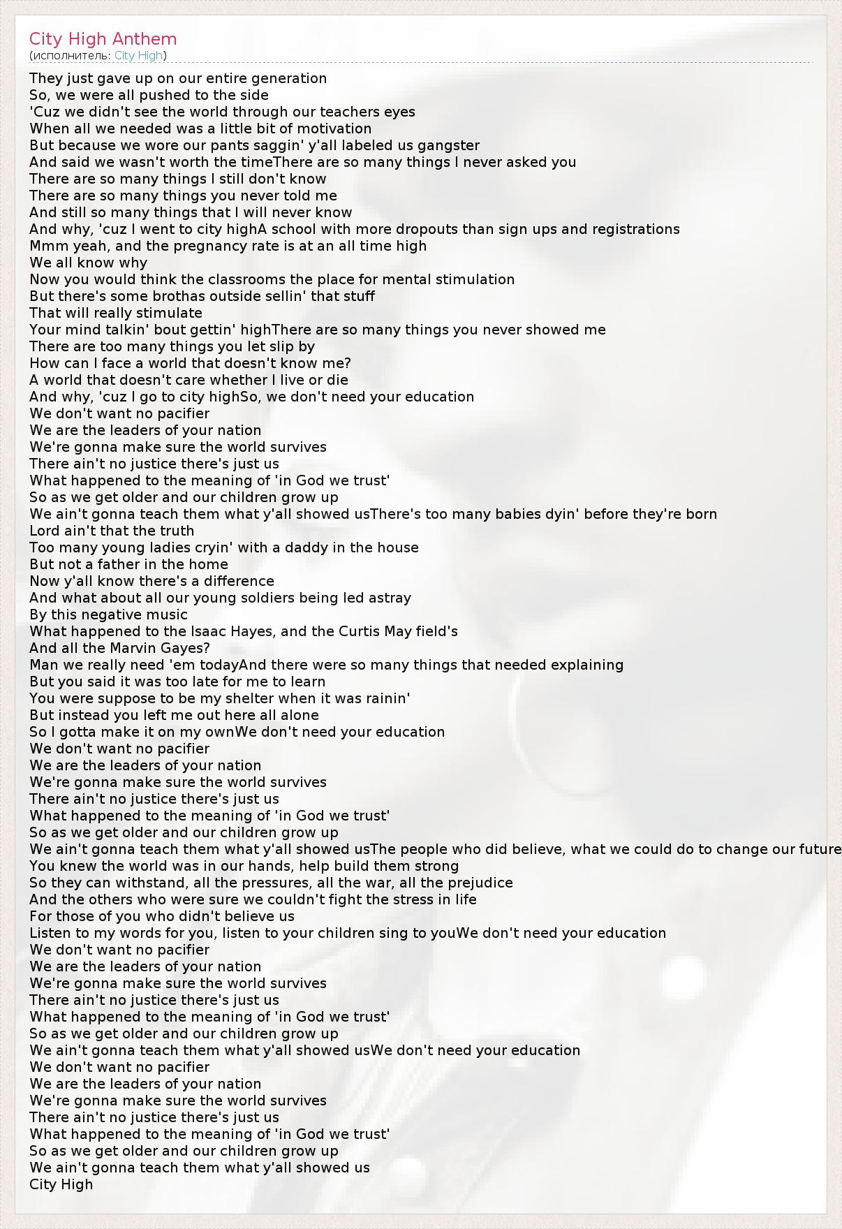 They just gave up on our entire generation So, we were all pushed to the side 'Cuz we didn't see the world through our teachers eyes When all we needed was a little bit of motivation But because we wore our pants saggin' y'all labeled us gangster And said we wasn't worth the timeThere are so many things I never asked you There are so many things I still don't know There are so many things you never told me And still so many things that I will never know And why, 'cuz I went to city highA school with more dropouts than sign ups and registrations Mmm yeah, and the pregnancy rate is at an all time high We all know why Now you would think the classrooms the place for mental stimulation But there's some brothas outside sellin' that stuff That will really stimulate Your mind talkin' bout gettin' highThere are so many things you never showed me There are too many things you let slip by How can I face a world that doesn't know me? A world that doesn't care whether I live or die And why, 'cuz I go to city highSo, we don't need your education We don't want no pacifier We are the leaders of your nation We're gonna make sure the world survives There ain't no justice there's just us What happened to the meaning of 'in God we trust' So as we get older and our children grow up We ain't gonna teach them what y'all showed usThere's too many babies dyin' before they're born Lord ain't that the truth Too many young ladies cryin' with a daddy in the house But not a father in the home Now y'all know there's a difference And what about all our young soldiers being led astray By this negative music What happened to the Isaac Hayes, and the Curtis May field's And all the Marvin Gayes? Man we really need 'em todayAnd there were so many things that needed explaining But you said it was too late for me to learn You were suppose to be my shelter when it was rainin' But instead you left me out here all alone So I gotta make it on my ownWe don't need your education We don't want no pacifier We are the leaders of your nation We're gonna make sure the world survives There ain't no justice there's just us What happened to the meaning of 'in God we trust' So as we get older and our children grow up We ain't gonna teach them what y'all showed usThe people who did believe, what we could do to change our future You knew the world was in our hands, help build them strong So they can withstand, all the pressures, all the war, all the prejudice And the others who were sure we couldn't fight the stress in life For those of you who didn't believe us Listen to my words for you, listen to your children sing to youWe don't need your education We don't want no pacifier We are the leaders of your nation We're gonna make sure the world survives There ain't no justice there's just us What happened to the meaning of 'in God we trust' So as we get older and our children grow up We ain't gonna teach them what y'all showed usWe don't need your education We don't want no pacifier We are the leaders of your nation We're gonna make sure the world survives There ain't no justice there's just us What happened to the meaning of 'in God we trust' So as we get older and our children grow up We ain't gonna teach them what y'all showed us City High
