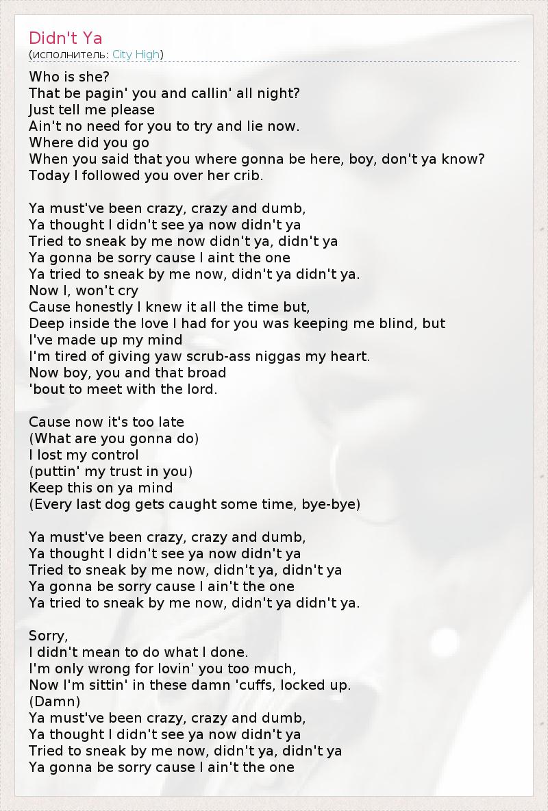 Who is she? That be pagin' you and callin' all night? Just tell me please Ain't no need for you to try and lie now. Where did you go When you said that you where gonna be here, boy, don't ya know? Today I followed you over her crib. Ya must've been crazy, crazy and dumb, Ya thought I didn't see ya now didn't ya Tried to sneak by me now didn't ya, didn't ya Ya gonna be sorry cause I aint the one Ya tried to sneak by me now, didn't ya didn't ya. Now I, won't cry Cause honestly I knew it all the time but, Deep inside the love I had for you was keeping me blind, but I've made up my mind I'm tired of giving yaw scrub-ass niggas my heart. Now boy, you and that broad 'bout to meet with the lord. Cause now it's too late (What are you gonna do) I lost my control (puttin' my trust in you) Keep this on ya mind (Every last dog gets caught some time, bye-bye) Ya must've been crazy, crazy and dumb, Ya thought I didn't see ya now didn't ya Tried to sneak by me now, didn't ya, didn't ya Ya gonna be sorry cause I ain't the one Ya tried to sneak by me now, didn't ya didn't ya. Sorry, I didn't mean to do what I done. I'm only wrong for lovin' you too much, Now I'm sittin' in these damn 'cuffs, locked up. (Damn) Ya must've been crazy, crazy and dumb, Ya thought I didn't see ya now didn't ya Tried to sneak by me now, didn't ya, didn't ya Ya gonna be sorry cause I ain't the one