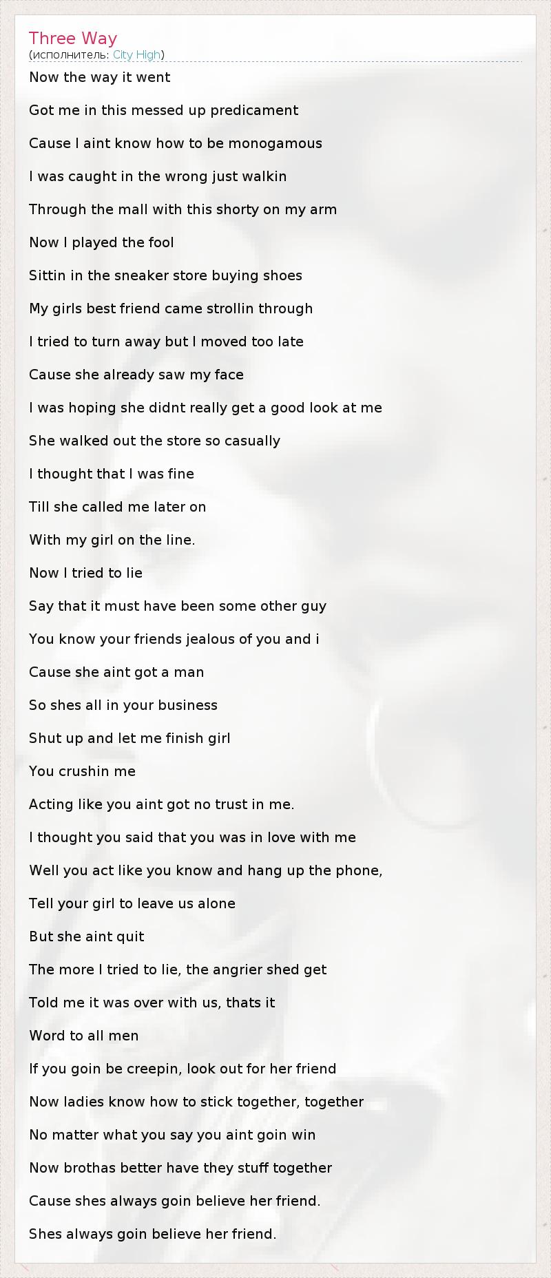 Now the way it went Got me in this messed up predicament Cause I aint know how to be monogamous I was caught in the wrong just walkin Through the mall with this shorty on my arm Now I played the fool Sittin in the sneaker store buying shoes My girls best friend came strollin through I tried to turn away but I moved too late Cause she already saw my face I was hoping she didnt really get a good look at me She walked out the store so casually I thought that I was fine Till she called me later on With my girl on the line. Now I tried to lie Say that it must have been some other guy You know your friends jealous of you and i Cause she aint got a man So shes all in your business Shut up and let me finish girl You crushin me Acting like you aint got no trust in me. I thought you said that you was in love with me Well you act like you know and hang up the phone, Tell your girl to leave us alone But she aint quit The more I tried to lie, the angrier shed get Told me it was over with us, thats it Word to all men If you goin be creepin, look out for her friend Now ladies know how to stick together, together No matter what you say you aint goin win Now brothas better have they stuff together Cause shes always goin believe her friend. Shes always goin believe her friend.