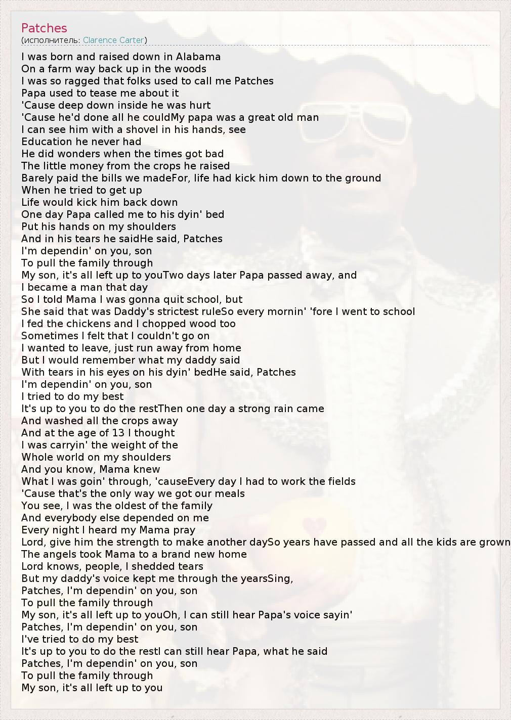 I was born and raised down in Alabama On a farm way back up in the woods I was so ragged that folks used to call me Patches Papa used to tease me about it 'Cause deep down inside he was hurt 'Cause he'd done all he couldMy papa was a great old man I can see him with a shovel in his hands, see Education he never had He did wonders when the times got bad The little money from the crops he raised Barely paid the bills we madeFor, life had kick him down to the ground When he tried to get up Life would kick him back down One day Papa called me to his dyin' bed Put his hands on my shoulders And in his tears he saidHe said, Patches I'm dependin' on you, son To pull the family through My son, it's all left up to youTwo days later Papa passed away, and I became a man that day So I told Mama I was gonna quit school, but She said that was Daddy's strictest ruleSo every mornin' 'fore I went to school I fed the chickens and I chopped wood too Sometimes I felt that I couldn't go on I wanted to leave, just run away from home But I would remember what my daddy said With tears in his eyes on his dyin' bedHe said, Patches I'm dependin' on you, son I tried to do my best It's up to you to do the restThen one day a strong rain came And washed all the crops away And at the age of 13 I thought I was carryin' the weight of the Whole world on my shoulders And you know, Mama knew What I was goin' through, 'causeEvery day I had to work the fields 'Cause that's the only way we got our meals You see, I was the oldest of the family And everybody else depended on me Every night I heard my Mama pray Lord, give him the strength to make another daySo years have passed and all the kids are grown The angels took Mama to a brand new home Lord knows, people, I shedded tears But my daddy's voice kept me through the yearsSing, Patches, I'm dependin' on you, son To pull the family through My son, it's all left up to youOh, I can still hear Papa's voice sayin' Patches, I'm dependin' on you, son I've tried to do my best It's up to you to do the restI can still hear Papa, what he said Patches, I'm dependin' on you, son To pull the family through My son, it's all left up to you