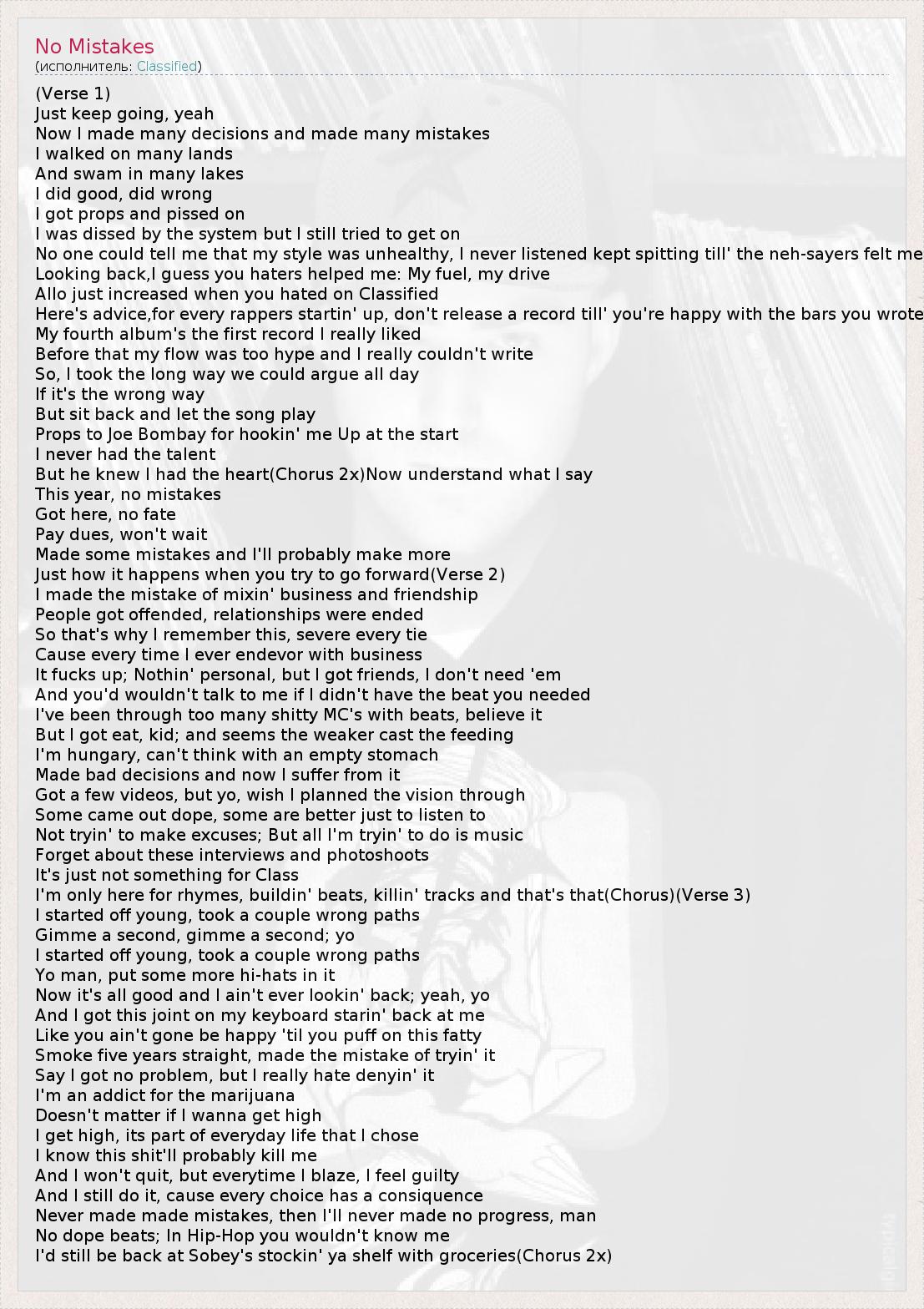 (Verse 1) Just keep going, yeah Now I made many decisions and made many mistakes I walked on many lands And swam in many lakes I did good, did wrong I got props and pissed on I was dissed by the system but I still tried to get on No one could tell me that my style was unhealthy, I never listened kept spitting till' the neh-sayers felt me Looking back,I guess you haters helped me: My fuel, my drive Allo just increased when you hated on Classified Here's advice,for every rappers startin' up, don't release a record till' you're happy with the bars you wrote My fourth album's the first record I really liked Before that my flow was too hype and I really couldn't write So, I took the long way we could argue all day If it's the wrong way But sit back and let the song play Props to Joe Bombay for hookin' me Up at the start I never had the talent But he knew I had the heart(Chorus 2x)Now understand what I say This year, no mistakes Got here, no fate Pay dues, won't wait Made some mistakes and I'll probably make more Just how it happens when you try to go forward(Verse 2) I made the mistake of mixin' business and friendship People got offended, relationships were ended So that's why I remember this, severe every tie Cause every time I ever endevor with business It fucks up; Nothin' personal, but I got friends, I don't need 'em And you'd wouldn't talk to me if I didn't have the beat you needed I've been through too many shitty MC's with beats, believe it But I got eat, kid; and seems the weaker cast the feeding I'm hungary, can't think with an empty stomach Made bad decisions and now I suffer from it Got a few videos, but yo, wish I planned the vision through Some came out dope, some are better just to listen to Not tryin' to make excuses; But all I'm tryin' to do is music Forget about these interviews and photoshoots It's just not something for Class I'm only here for rhymes, buildin' beats, killin' tracks and that's that(Chorus)(Verse 3) I started off young, took a couple wrong paths Gimme a second, gimme a second; yo I started off young, took a couple wrong paths Yo man, put some more hi-hats in it Now it's all good and I ain't ever lookin' back; yeah, yo And I got this joint on my keyboard starin' back at me Like you ain't gone be happy 'til you puff on this fatty Smoke five years straight, made the mistake of tryin' it Say I got no problem, but I really hate denyin' it I'm an addict for the marijuana Doesn't matter if I wanna get high I get high, its part of everyday life that I chose I know this shit'll probably kill me And I won't quit, but everytime I blaze, I feel guilty And I still do it, cause every choice has a consiquence Never made made mistakes, then I'll never made no progress, man No dope beats; In Hip-Hop you wouldn't know me I'd still be back at Sobey's stockin' ya shelf with groceries(Chorus 2x)