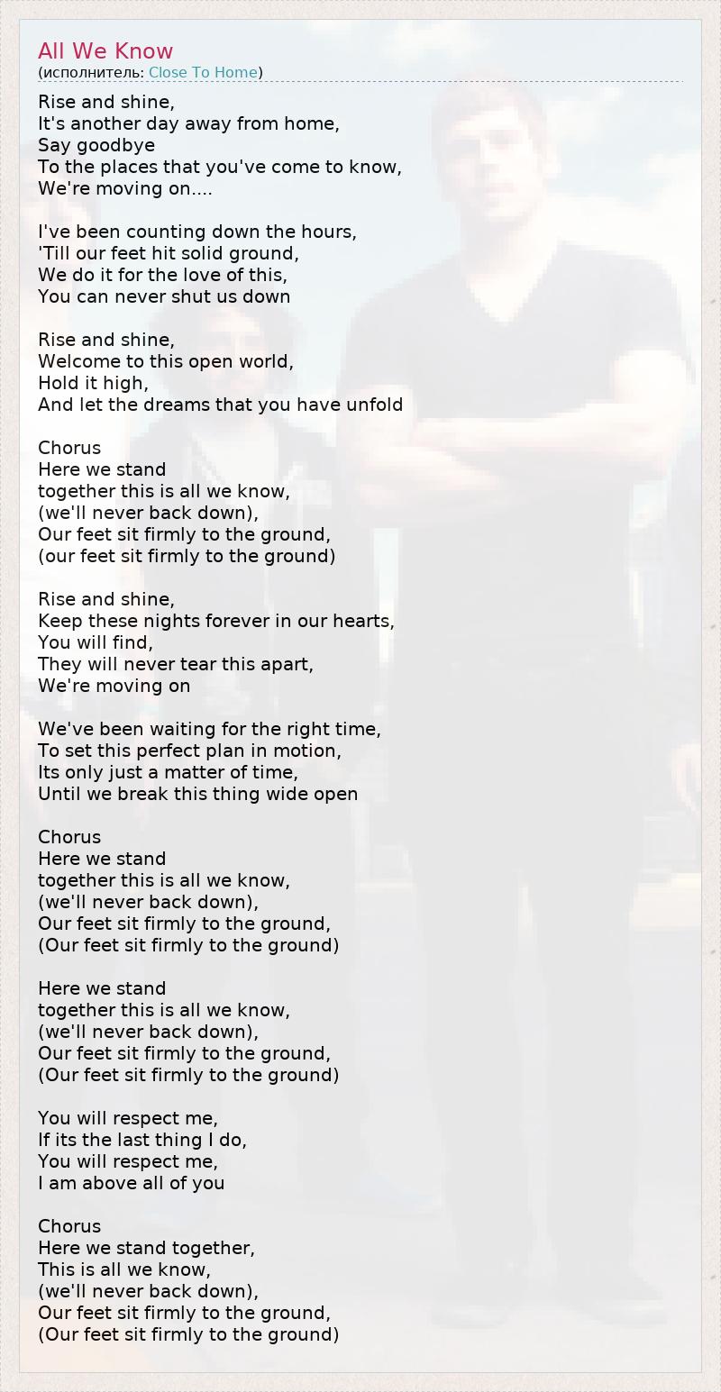 Rise and shine, It's another day away from home, Say goodbye To the places that you've come to know, We're moving on.... I've been counting down the hours, 'Till our feet hit solid ground, We do it for the love of this, You can never shut us down Rise and shine, Welcome to this open world, Hold it high, And let the dreams that you have unfold Chorus Here we stand together this is all we know, (we'll never back down), Our feet sit firmly to the ground, (our feet sit firmly to the ground) Rise and shine, Keep these nights forever in our hearts, You will find, They will never tear this apart, We're moving on We've been waiting for the right time, To set this perfect plan in motion, Its only just a matter of time, Until we break this thing wide open Chorus Here we stand together this is all we know, (we'll never back down), Our feet sit firmly to the ground, (Our feet sit firmly to the ground) Here we stand together this is all we know, (we'll never back down), Our feet sit firmly to the ground, (Our feet sit firmly to the ground) You will respect me, If its the last thing I do, You will respect me, I am above all of you Chorus Here we stand together, This is all we know, (we'll never back down), Our feet sit firmly to the ground, (Our feet sit firmly to the ground)