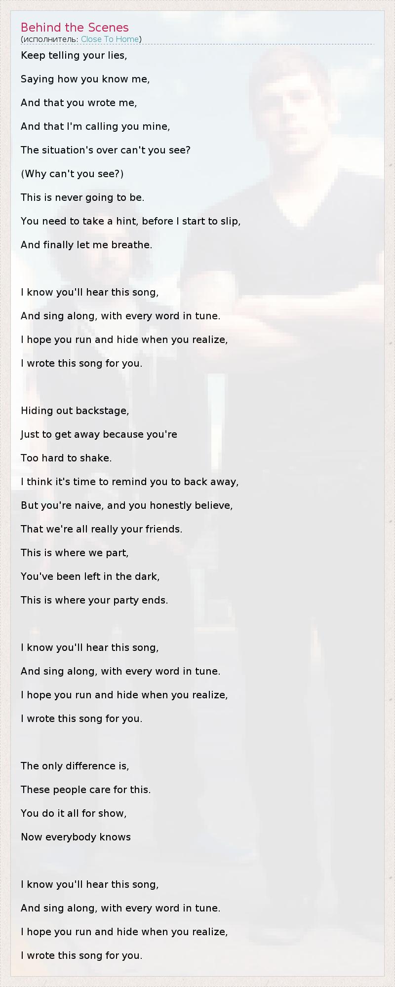 Keep telling your lies, Saying how you know me, And that you wrote me, And that I'm calling you mine, The situation's over can't you see? (Why can't you see?) This is never going to be. You need to take a hint, before I start to slip, And finally let me breathe. I know you'll hear this song, And sing along, with every word in tune. I hope you run and hide when you realize, I wrote this song for you. Hiding out backstage, Just to get away because you're Too hard to shake. I think it's time to remind you to back away, But you're naive, and you honestly believe, That we're all really your friends. This is where we part, You've been left in the dark, This is where your party ends. I know you'll hear this song, And sing along, with every word in tune. I hope you run and hide when you realize, I wrote this song for you. The only difference is, These people care for this. You do it all for show, Now everybody knows I know you'll hear this song, And sing along, with every word in tune. I hope you run and hide when you realize, I wrote this song for you.