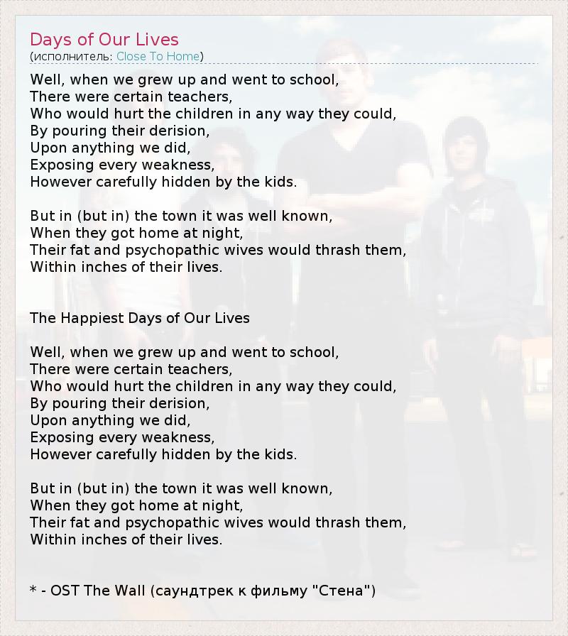А как ты думаешь, о чем песня "Days of Our Lives" ?