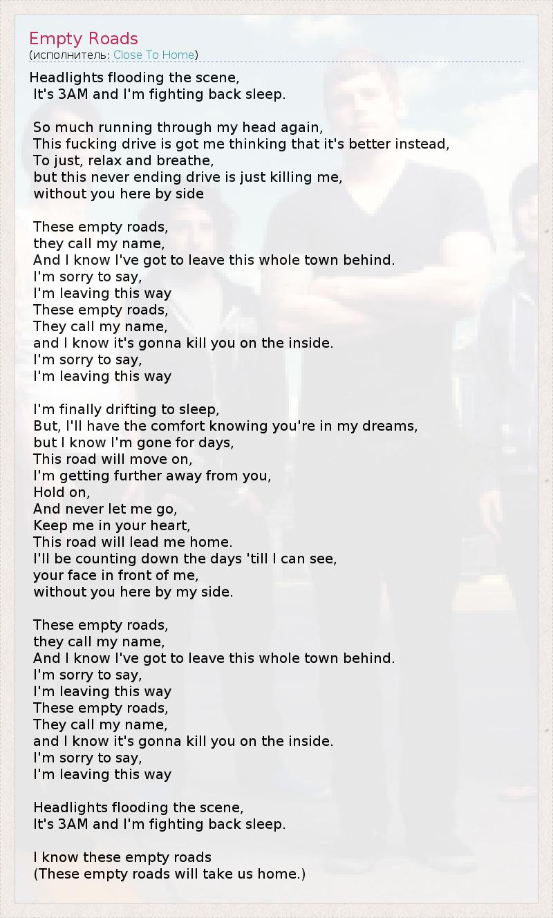 Фары наводнения сцену , Это 3 утра , и я отпор сон. Так много работает в моей голове снова , Это чертовски привод заставило меня задуматься , что лучше вместо этого, Чтобы просто , расслабиться и дышать , но это никогда не заканчивается привод просто убивает меня , без тебя здесь сторона Эти пустые дороги, они называют мое имя , И я знаю, что я должен оставить весь этот город позади. Я вынужден сказать, что , Я ухожу этот путь Эти пустые дороги, Они называют свое имя , и я знаю, что это убьет тебя внутри. Я вынужден сказать, что , Я ухожу этот путь Я , наконец, дрейфующих спать , Но , я буду иметь комфорт , зная, что ты в моих мечтах , но я знаю, что я пошел в течение нескольких дней , Эта дорога будет двигаться дальше, Я получаю дальше от вас , Держись, И никогда не отпустить меня , Запомнить меня в своем сердце, Эта дорога приведет меня домой. Я буду отсчетдней , пока я не вижу , Ваше лицо передо мной , без тебя на моей стороне. Эти пустые дороги, они называют мое имя , И я знаю, что я должен оставить весь этот город позади. Я вынужден сказать, что , Я ухожу этот путь Эти пустые дороги, Они называют свое имя , и я знаю, что это убьет тебя внутри. Я вынужден сказать, что , Я ухожу этот путь Фары наводнения сцену , Это 3 утра , и я отпор сон. Я знаю эти пустые дороги ( Эти пустые дороги приведет нас домой. )