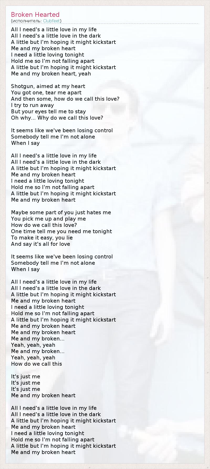 All I need's a little love in my life All I need's a little love in the dark A little but I'm hoping it might kickstart Me and my broken heart I need a little loving tonight Hold me so I'm not falling apart A little but I'm hoping it might kickstart Me and my broken heart, yeah Shotgun, aimed at my heart You got one, tear me apart And then some, how do we call this love? I try to run away But your eyes tell me to stay Oh why... Why do we call this love? It seems like we've been losing control Somebody tell me I'm not alone When I say All I need's a little love in my life All I need's a little love in the dark A little but I'm hoping it might kickstart Me and my broken heart I need a little loving tonight Hold me so I'm not falling apart A little but I'm hoping it might kickstart Me and my broken heart Maybe some part of you just hates me You pick me up and play me How do we call this love? One time tell me you need me tonight To make it easy, you lie And say it's all for love It seems like we've been losing control Somebody tell me I'm not alone When I say All I need's a little love in my life All I need's a little love in the dark A little but I'm hoping it might kickstart Me and my broken heart I need a little loving tonight Hold me so I'm not falling apart A little but I'm hoping it might kickstart Me and my broken heart Me and my broken heart Me and my broken... Yeah, yeah, yeah Me and my broken... Yeah, yeah, yeah How do we call this It's just me It's just me It's just me Me and my broken heart All I need's a little love in my life All I need's a little love in the dark A little but I'm hoping it might kickstart Me and my broken heart I need a little loving tonight Hold me so I'm not falling apart A little but I'm hoping it might kickstart Me and my broken heart