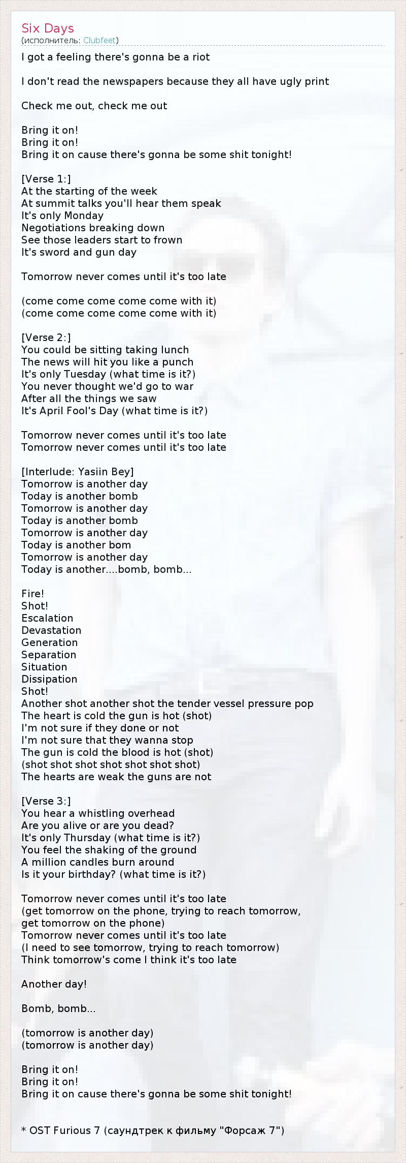 I got a feeling there's gonna be a riot I don't read the newspapers because they all have ugly print Check me out, check me out Bring it on! Bring it on! Bring it on cause there's gonna be some shit tonight! [Verse 1:] At the starting of the week At summit talks you'll hear them speak It's only Monday Negotiations breaking down See those leaders start to frown It's sword and gun day Tomorrow never comes until it's too late (come come come come come with it) (come come come come come with it) [Verse 2:] You could be sitting taking lunch The news will hit you like a punch It's only Tuesday (what time is it?) You never thought we'd go to war After all the things we saw It's April Fool's Day (what time is it?) Tomorrow never comes until it's too late Tomorrow never comes until it's too late [Interlude: Yasiin Bey] Tomorrow is another day Today is another bomb Tomorrow is another day Today is another bomb Tomorrow is another day Today is another bom Tomorrow is another day Today is another....bomb, bomb... Fire! Shot! Escalation Devastation Generation Separation Situation Dissipation Shot! Another shot another shot the tender vessel pressure pop The heart is cold the gun is hot (shot) I'm not sure if they done or not I'm not sure that they wanna stop The gun is cold the blood is hot (shot) (shot shot shot shot shot shot shot) The hearts are weak the guns are not [Verse 3:] You hear a whistling overhead Are you alive or are you dead? It's only Thursday (what time is it?) You feel the shaking of the ground A million candles burn around Is it your birthday? (what time is it?) Tomorrow never comes until it's too late (get tomorrow on the phone, trying to reach tomorrow, get tomorrow on the phone) Tomorrow never comes until it's too late (I need to see tomorrow, trying to reach tomorrow) Think tomorrow's come I think it's too late Another day! Bomb, bomb... (tomorrow is another day) (tomorrow is another day) Bring it on! Bring it on! Bring it on cause there's gonna be some shit tonight! * OST Furious 7 (саундтрек к фильму "Форсаж 7")