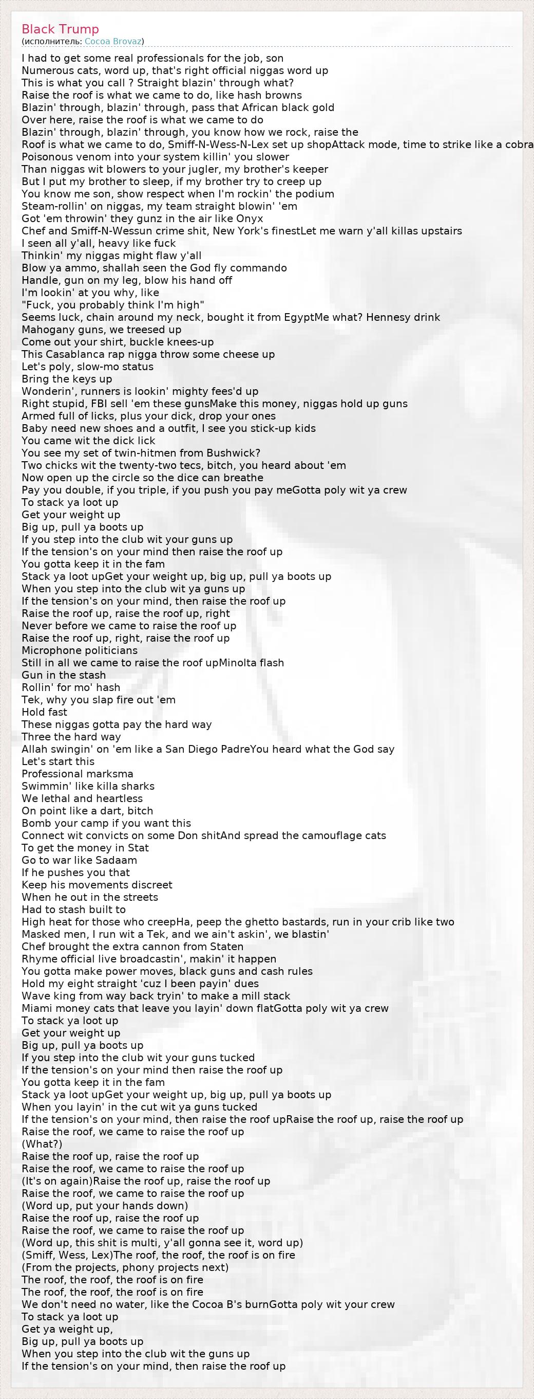 Это интересно:Cocoa Brovaz (aka Smif-n-Wessun ) - дуэт бруклинских MC - TEK и Steele, вошедших позже вместе с Buckshot, Heltah Skeltah и Originoo Gunn Clappaz в состав супергруппы Boot Camp Click.Дебютировали в 1993 на альбоме Black Moon «Enta da Stage» на трэках «Black Smif-n-Wessun» и «U Da Man». В 1994 выпустили сингл «Bucktown», получивший признание underground-общественности. Это дало толчок к выходу в январе 1995 года альбома «Dah Shinin», который дебютировал в пятёрке Top R&B/Hip-Hop Albums.... продолжение
