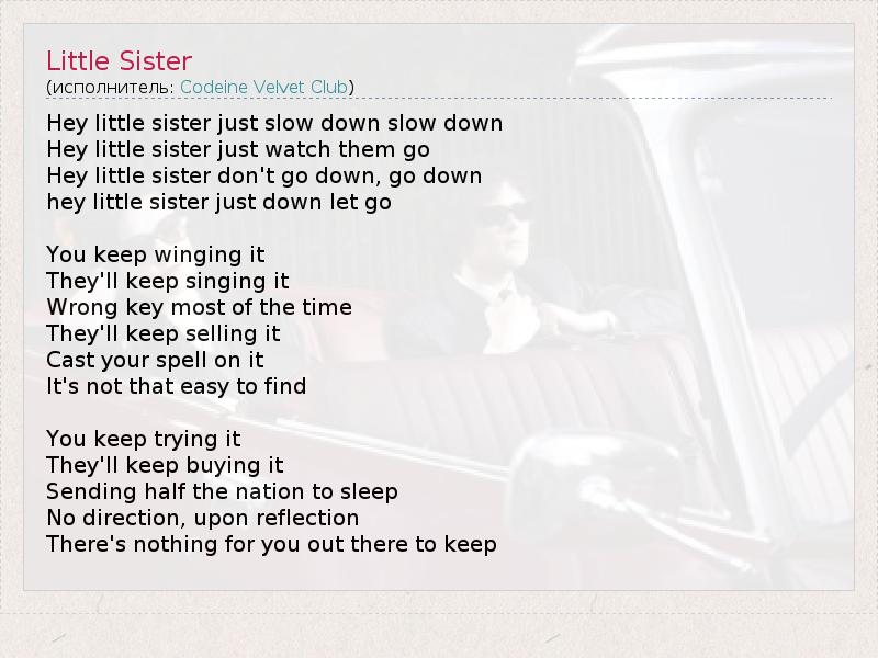 Это интересно:Codeine Velvet Club образовались в 2009-ом году двумя людьми: Лу Хики и Джоном Лавлером. Также вместе с ними выступает клавишник группы The Tears, Уилл Фостер, который до этого постоянно гастролировал вместе с The Fratellis, основной группой Лавлера, как сессионный музыкант. Вообще, инициатором создания «Клуба» стал именно Лавлер, которому нужна была своеобразная передышка перед записью третьего альбома... продолжение