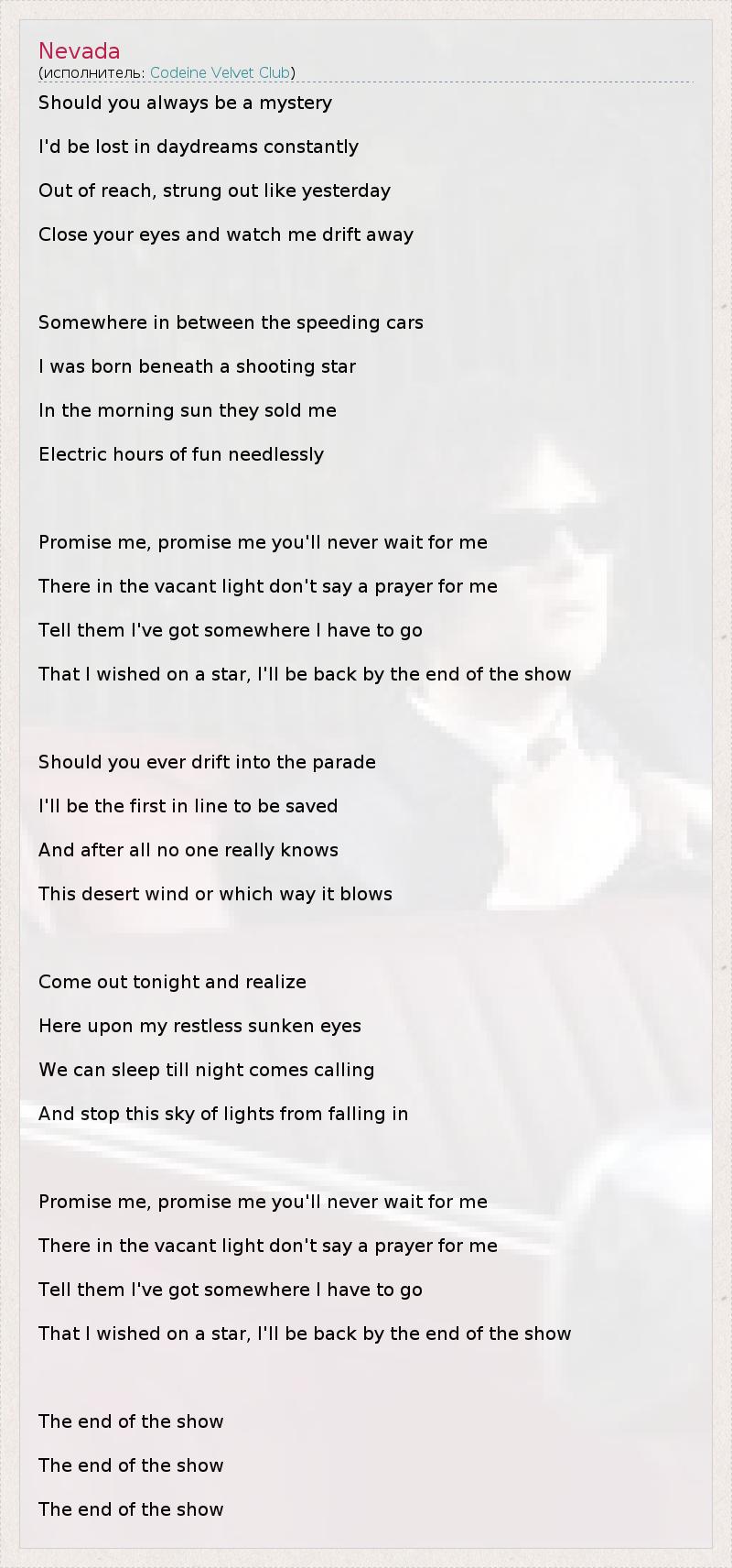 Это интересно:Codeine Velvet Club образовались в 2009-ом году двумя людьми: Лу Хики и Джоном Лавлером. Также вместе с ними выступает клавишник группы The Tears, Уилл Фостер, который до этого постоянно гастролировал вместе с The Fratellis, основной группой Лавлера, как сессионный музыкант. Вообще, инициатором создания «Клуба» стал именно Лавлер, которому нужна была своеобразная передышка перед записью третьего альбома... продолжение