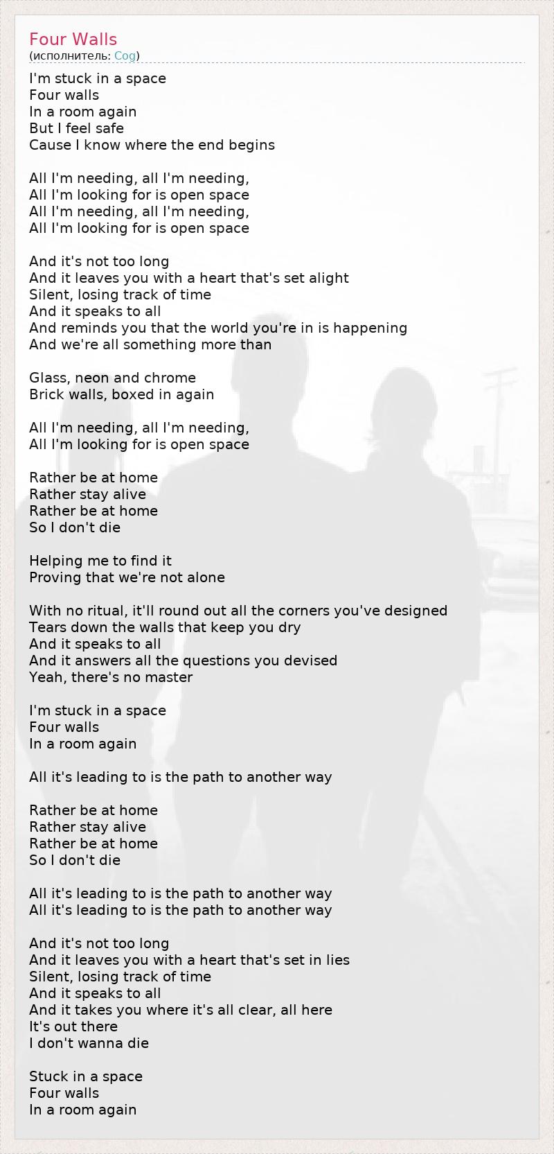 I'm stuck in a space Four walls In a room again But I feel safe Cause I know where the end begins All I'm needing, all I'm needing, All I'm looking for is open space All I'm needing, all I'm needing, All I'm looking for is open space And it's not too long And it leaves you with a heart that's set alight Silent, losing track of time And it speaks to all And reminds you that the world you're in is happening And we're all something more than Glass, neon and chrome Brick walls, boxed in again All I'm needing, all I'm needing, All I'm looking for is open space Rather be at home Rather stay alive Rather be at home So I don't die Helping me to find it Proving that we're not alone With no ritual, it'll round out all the corners you've designed Tears down the walls that keep you dry And it speaks to all And it answers all the questions you devised Yeah, there's no master I'm stuck in a space Four walls In a room again All it's leading to is the path to another way Rather be at home Rather stay alive Rather be at home So I don't die All it's leading to is the path to another way All it's leading to is the path to another way And it's not too long And it leaves you with a heart that's set in lies Silent, losing track of time And it speaks to all And it takes you where it's all clear, all here It's out there I don't wanna die Stuck in a space Four walls In a room again