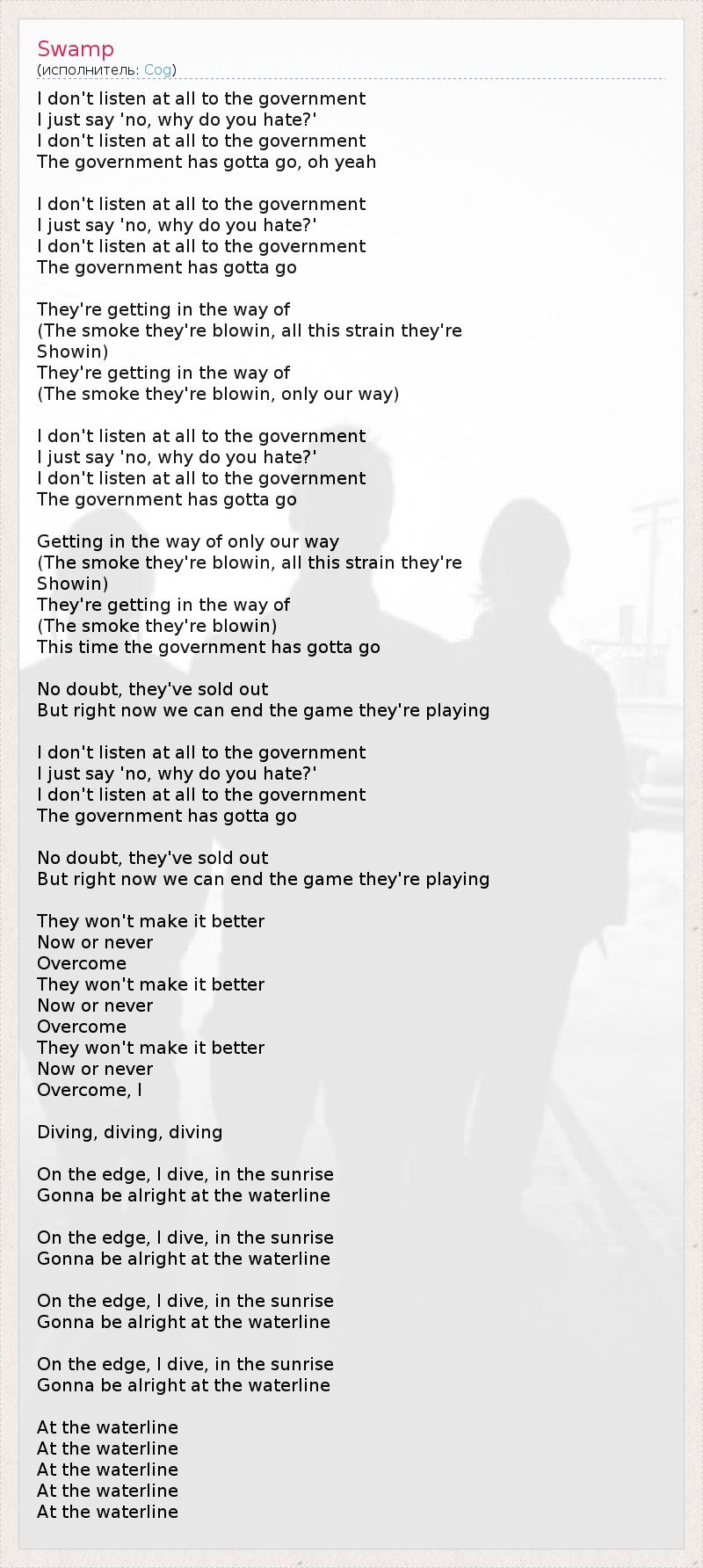 I don't listen at all to the government I just say 'no, why do you hate?' I don't listen at all to the government The government has gotta go, oh yeah I don't listen at all to the government I just say 'no, why do you hate?' I don't listen at all to the government The government has gotta go They're getting in the way of (The smoke they're blowin, all this strain they're Showin) They're getting in the way of (The smoke they're blowin, only our way) I don't listen at all to the government I just say 'no, why do you hate?' I don't listen at all to the government The government has gotta go Getting in the way of only our way (The smoke they're blowin, all this strain they're Showin) They're getting in the way of (The smoke they're blowin) This time the government has gotta go No doubt, they've sold out But right now we can end the game they're playing I don't listen at all to the government I just say 'no, why do you hate?' I don't listen at all to the government The government has gotta go No doubt, they've sold out But right now we can end the game they're playing They won't make it better Now or never Overcome They won't make it better Now or never Overcome They won't make it better Now or never Overcome, I Diving, diving, diving On the edge, I dive, in the sunrise Gonna be alright at the waterline On the edge, I dive, in the sunrise Gonna be alright at the waterline On the edge, I dive, in the sunrise Gonna be alright at the waterline On the edge, I dive, in the sunrise Gonna be alright at the waterline At the waterline At the waterline At the waterline At the waterline At the waterline