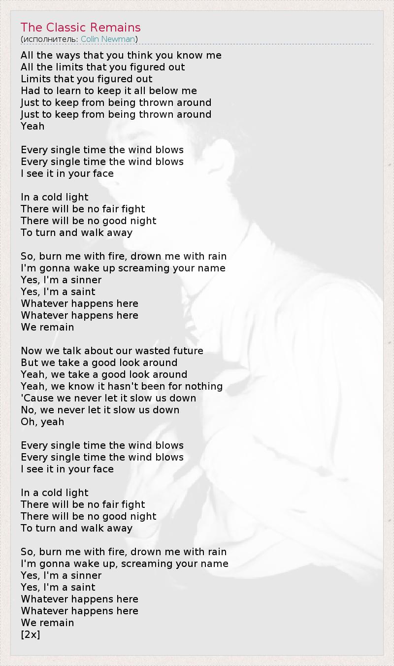 All the ways that you think you know me All the limits that you figured out Limits that you figured out Had to learn to keep it all below me Just to keep from being thrown around Just to keep from being thrown around Yeah Every single time the wind blows Every single time the wind blows I see it in your face In a cold light There will be no fair fight There will be no good night To turn and walk away So, burn me with fire, drown me with rain I'm gonna wake up screaming your name Yes, I'm a sinner Yes, I'm a saint Whatever happens here Whatever happens here We remain Now we talk about our wasted future But we take a good look around Yeah, we take a good look around Yeah, we know it hasn't been for nothing 'Cause we never let it slow us down No, we never let it slow us down Oh, yeah Every single time the wind blows Every single time the wind blows I see it in your face In a cold light There will be no fair fight There will be no good night To turn and walk away So, burn me with fire, drown me with rain I'm gonna wake up, screaming your name Yes, I'm a sinner Yes, I'm a saint Whatever happens here Whatever happens here We remain [2x]