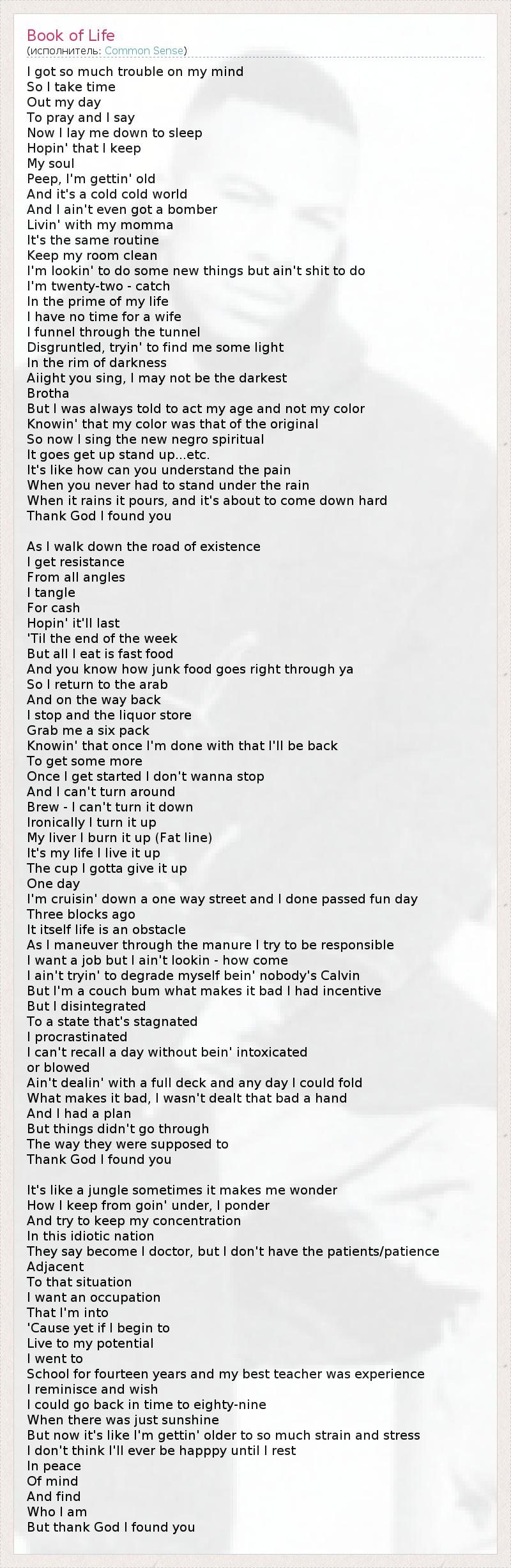 I got so much trouble on my mind So I take time Out my day To pray and I say Now I lay me down to sleep Hopin' that I keep My soul Peep, I'm gettin' old And it's a cold cold world And I ain't even got a bomber Livin' with my momma It's the same routine Keep my room clean I'm lookin' to do some new things but ain't shit to do I'm twenty-two - catch In the prime of my life I have no time for a wife I funnel through the tunnel Disgruntled, tryin' to find me some light In the rim of darkness Aiight you sing, I may not be the darkest Brotha But I was always told to act my age and not my color Knowin' that my color was that of the original So now I sing the new negro spiritual It goes get up stand up...etc. It's like how can you understand the pain When you never had to stand under the rain When it rains it pours, and it's about to come down hard Thank God I found you As I walk down the road of existence I get resistance From all angles I tangle For cash Hopin' it'll last 'Til the end of the week But all I eat is fast food And you know how junk food goes right through ya So I return to the arab And on the way back I stop and the liquor store Grab me a six pack Knowin' that once I'm done with that I'll be back To get some more Once I get started I don't wanna stop And I can't turn around Brew - I can't turn it down Ironically I turn it up My liver I burn it up (Fat line) It's my life I live it up The cup I gotta give it up One day I'm cruisin' down a one way street and I done passed fun day Three blocks ago It itself life is an obstacle As I maneuver through the manure I try to be responsible I want a job but I ain't lookin - how come I ain't tryin' to degrade myself bein' nobody's Calvin But I'm a couch bum what makes it bad I had incentive But I disintegrated To a state that's stagnated I procrastinated I can't recall a day without bein' intoxicated or blowed Ain't dealin' with a full deck and any day I could fold What makes it bad, I wasn't dealt that bad a hand And I had a plan But things didn't go through The way they were supposed to Thank God I found you It's like a jungle sometimes it makes me wonder How I keep from goin' under, I ponder And try to keep my concentration In this idiotic nation They say become I doctor, but I don't have the patients/patience Adjacent To that situation I want an occupation That I'm into 'Cause yet if I begin to Live to my potential I went to School for fourteen years and my best teacher was experience I reminisce and wish I could go back in time to eighty-nine When there was just sunshine But now it's like I'm gettin' older to so much strain and stress I don't think I'll ever be happpy until I rest In peace Of mind And find Who I am But thank God I found you