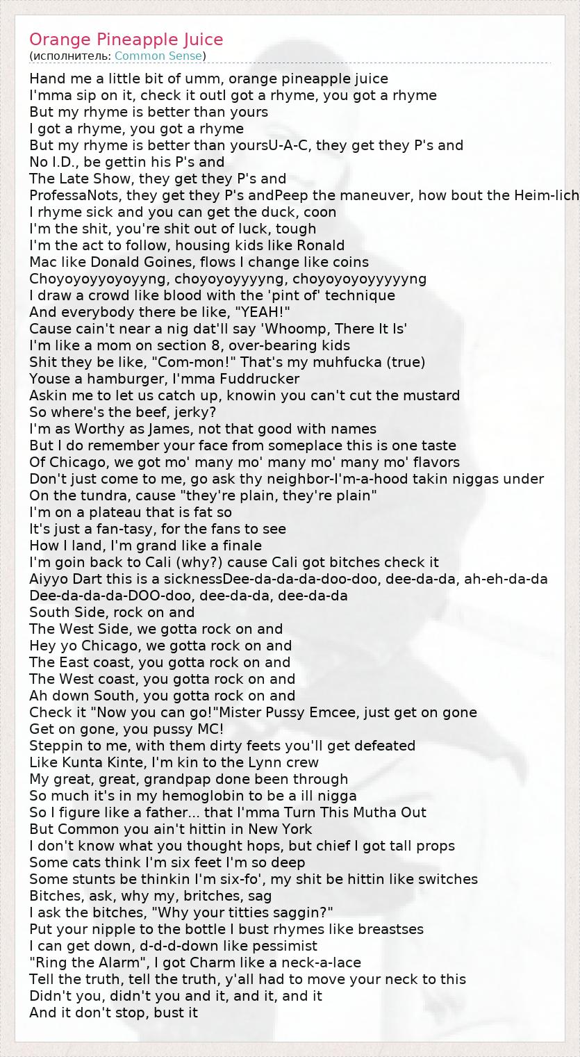 Hand me a little bit of umm, orange pineapple juice I'mma sip on it, check it outI got a rhyme, you got a rhyme But my rhyme is better than yours I got a rhyme, you got a rhyme But my rhyme is better than yoursU-A-C, they get they P's and No I.D., be gettin his P's and The Late Show, they get they P's and ProfessaNots, they get they P's andPeep the maneuver, how bout the Heim-lich I rhyme sick and you can get the duck, coon I'm the shit, you're shit out of luck, tough I'm the act to follow, housing kids like Ronald Mac like Donald Goines, flows I change like coins Choyoyoyyoyoyyng, choyoyoyyyyng, choyoyoyoyyyyyng I draw a crowd like blood with the 'pint of' technique And everybody there be like, "YEAH!" Cause cain't near a nig dat'll say 'Whoomp, There It Is' I'm like a mom on section 8, over-bearing kids Shit they be like, "Com-mon!" That's my muhfucka (true) Youse a hamburger, I'mma Fuddrucker Askin me to let us catch up, knowin you can't cut the mustard So where's the beef, jerky? I'm as Worthy as James, not that good with names But I do remember your face from someplace this is one taste Of Chicago, we got mo' many mo' many mo' many mo' flavors Don't just come to me, go ask thy neighbor-I'm-a-hood takin niggas under On the tundra, cause "they're plain, they're plain" I'm on a plateau that is fat so It's just a fan-tasy, for the fans to see How I land, I'm grand like a finale I'm goin back to Cali (why?) cause Cali got bitches check it Aiyyo Dart this is a sicknessDee-da-da-da-doo-doo, dee-da-da, ah-eh-da-da Dee-da-da-da-DOO-doo, dee-da-da, dee-da-da South Side, rock on and The West Side, we gotta rock on and Hey yo Chicago, we gotta rock on and The East coast, you gotta rock on and The West coast, you gotta rock on and Ah down South, you gotta rock on and Check it "Now you can go!"Mister Pussy Emcee, just get on gone Get on gone, you pussy MC! Steppin to me, with them dirty feets you'll get defeated Like Kunta Kinte, I'm kin to the Lynn crew My great, great, grandpap done been through So much it's in my hemoglobin to be a ill nigga So I figure like a father... that I'mma Turn This Mutha Out But Common you ain't hittin in New York I don't know what you thought hops, but chief I got tall props Some cats think I'm six feet I'm so deep Some stunts be thinkin I'm six-fo', my shit be hittin like switches Bitches, ask, why my, britches, sag I ask the bitches, "Why your titties saggin?" Put your nipple to the bottle I bust rhymes like breastses I can get down, d-d-d-down like pessimist "Ring the Alarm", I got Charm like a neck-a-lace Tell the truth, tell the truth, y'all had to move your neck to this Didn't you, didn't you and it, and it, and it And it don't stop, bust it