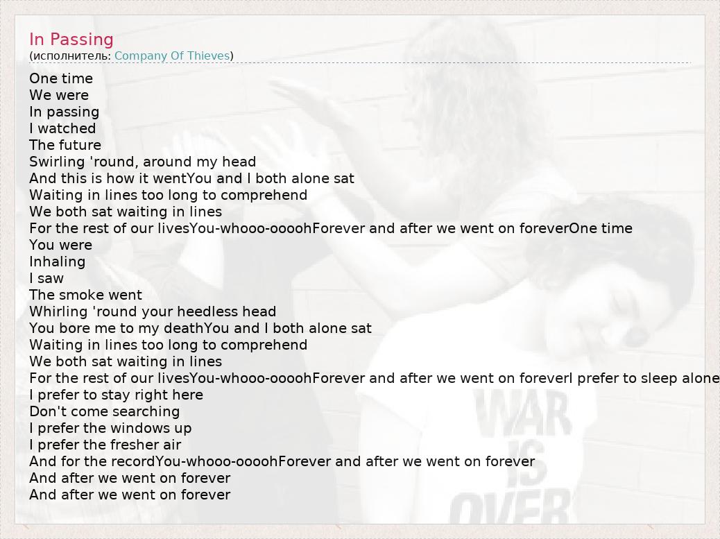 One time We were In passing I watched The future Swirling 'round, around my head And this is how it wentYou and I both alone sat Waiting in lines too long to comprehend We both sat waiting in lines For the rest of our livesYou-whooo-oooohForever and after we went on foreverOne time You were Inhaling I saw The smoke went Whirling 'round your heedless head You bore me to my deathYou and I both alone sat Waiting in lines too long to comprehend We both sat waiting in lines For the rest of our livesYou-whooo-oooohForever and after we went on foreverI prefer to sleep alone I prefer to stay right here Don't come searching I prefer the windows up I prefer the fresher air And for the recordYou-whooo-oooohForever and after we went on forever And after we went on forever And after we went on forever