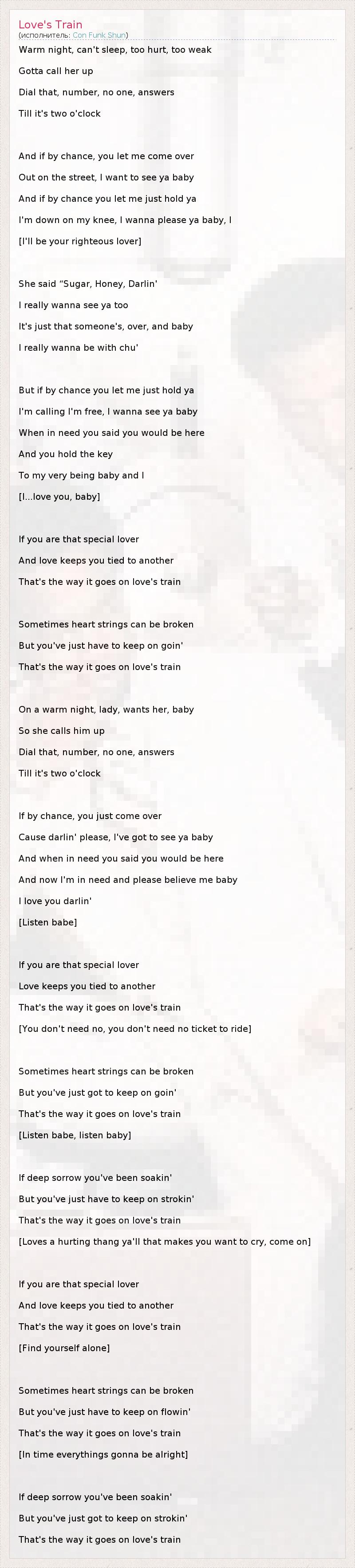 Warm night, can't sleep, too hurt, too weak Gotta call her up Dial that, number, no one, answers Till it's two o'clock And if by chance, you let me come over Out on the street, I want to see ya baby And if by chance you let me just hold ya I'm down on my knee, I wanna please ya baby, I [I'll be your righteous lover] She said “Sugar, Honey, Darlin' I really wanna see ya too It's just that someone's, over, and baby I really wanna be with chu' But if by chance you let me just hold ya I'm calling I'm free, I wanna see ya baby When in need you said you would be here And you hold the key To my very being baby and I [I...love you, baby] If you are that special lover And love keeps you tied to another That's the way it goes on love's train Sometimes heart strings can be broken But you've just have to keep on goin' That's the way it goes on love's train On a warm night, lady, wants her, baby So she calls him up Dial that, number, no one, answers Till it's two o'clock If by chance, you just come over Cause darlin' please, I've got to see ya baby And when in need you said you would be here And now I'm in need and please believe me baby I love you darlin' [Listen babe] If you are that special lover Love keeps you tied to another That's the way it goes on love's train [You don't need no, you don't need no ticket to ride] Sometimes heart strings can be broken But you've just got to keep on goin' That's the way it goes on love's train [Listen babe, listen baby] If deep sorrow you've been soakin' But you've just have to keep on strokin' That's the way it goes on love's train [Loves a hurting thang ya'll that makes you want to cry, come on] If you are that special lover And love keeps you tied to another That's the way it goes on love's train [Find yourself alone] Sometimes heart strings can be broken But you've just have to keep on flowin' That's the way it goes on love's train [In time everythings gonna be alright] If deep sorrow you've been soakin' But you've just got to keep on strokin' That's the way it goes on love's train