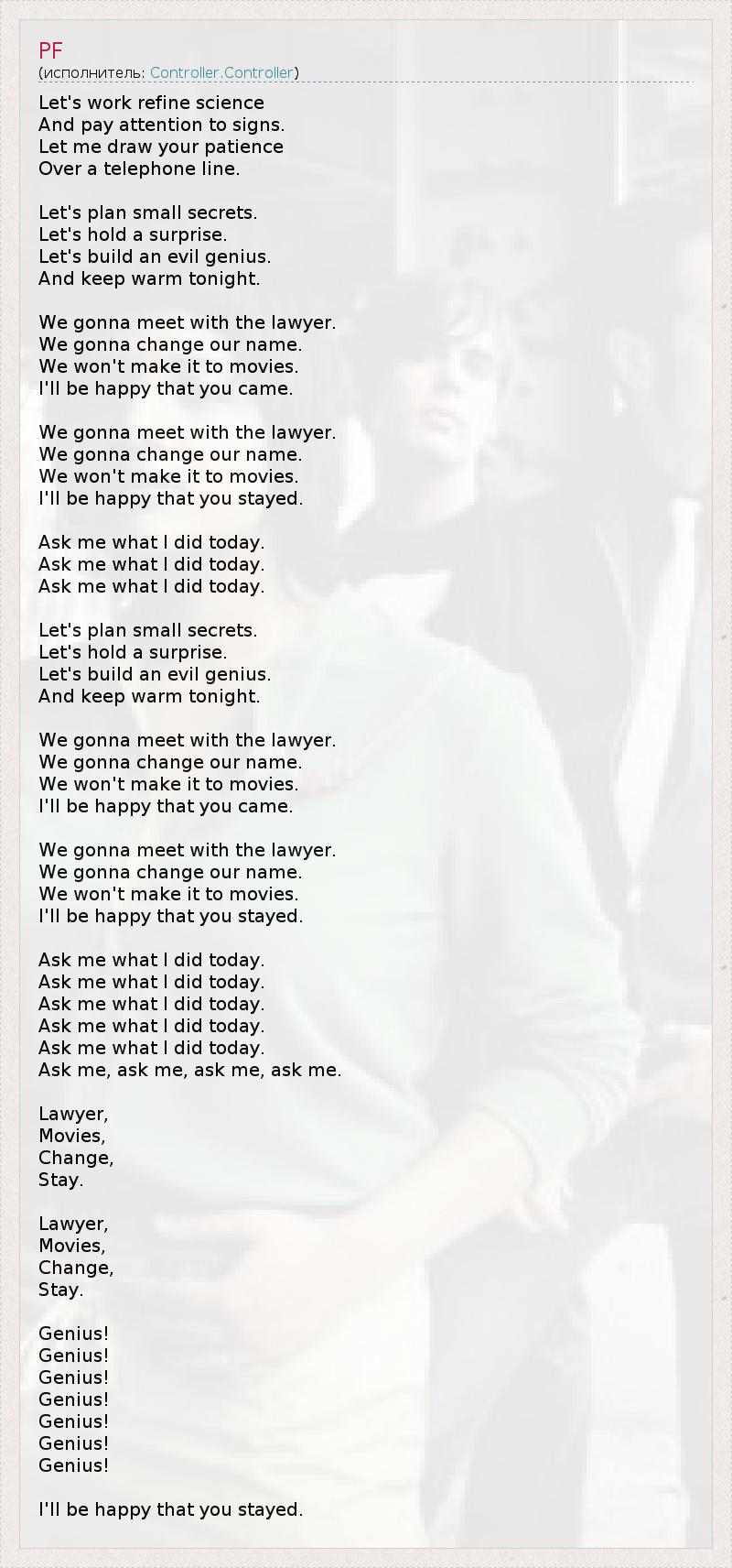 Let's work refine science And pay attention to signs. Let me draw your patience Over a telephone line. Let's plan small secrets. Let's hold a surprise. Let's build an evil genius. And keep warm tonight. We gonna meet with the lawyer. We gonna change our name. We won't make it to movies. I'll be happy that you came. We gonna meet with the lawyer. We gonna change our name. We won't make it to movies. I'll be happy that you stayed. Ask me what I did today. Ask me what I did today. Ask me what I did today. Let's plan small secrets. Let's hold a surprise. Let's build an evil genius. And keep warm tonight. We gonna meet with the lawyer. We gonna change our name. We won't make it to movies. I'll be happy that you came. We gonna meet with the lawyer. We gonna change our name. We won't make it to movies. I'll be happy that you stayed. Ask me what I did today. Ask me what I did today. Ask me what I did today. Ask me what I did today. Ask me what I did today. Ask me, ask me, ask me, ask me. Lawyer, Movies, Change, Stay. Lawyer, Movies, Change, Stay. Genius! Genius! Genius! Genius! Genius! Genius! Genius! I'll be happy that you stayed.