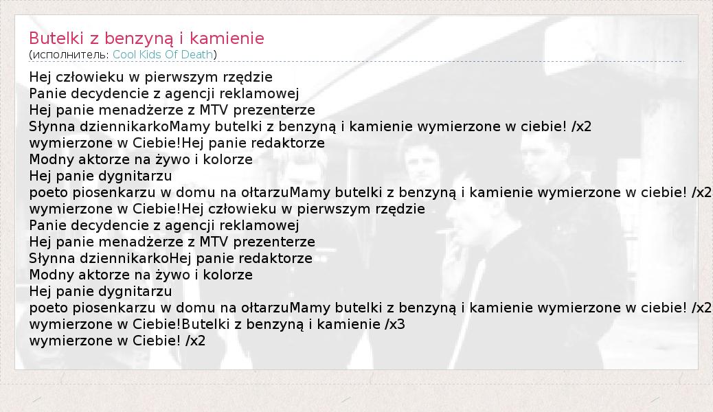 Hej człowieku w pierwszym rzędzie Panie decydencie z agencji reklamowej Hej panie menadżerze z MTV prezenterze Słynna dziennikarkoMamy butelki z benzyną i kamienie wymierzone w ciebie! /x2 wymierzone w Ciebie!Hej panie redaktorze Modny aktorze na żywo i kolorze Hej panie dygnitarzu poeto piosenkarzu w domu na ołtarzuMamy butelki z benzyną i kamienie wymierzone w ciebie! /x2 wymierzone w Ciebie!Hej człowieku w pierwszym rzędzie Panie decydencie z agencji reklamowej Hej panie menadżerze z MTV prezenterze Słynna dziennikarkoHej panie redaktorze Modny aktorze na żywo i kolorze Hej panie dygnitarzu poeto piosenkarzu w domu na ołtarzuMamy butelki z benzyną i kamienie wymierzone w ciebie! /x2 wymierzone w Ciebie!Butelki z benzyną i kamienie /x3 wymierzone w Ciebie! /x2