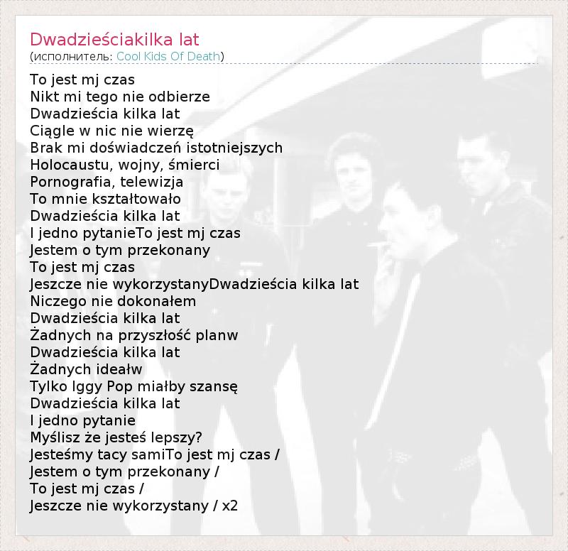 To jest mj czas Nikt mi tego nie odbierze Dwadzieścia kilka lat Ciągle w nic nie wierzę Brak mi doświadczeń istotniejszych Holocaustu, wojny, śmierci Pornografia, telewizja To mnie kształtowało Dwadzieścia kilka lat I jedno pytanieTo jest mj czas Jestem o tym przekonany To jest mj czas Jeszcze nie wykorzystanyDwadzieścia kilka lat Niczego nie dokonałem Dwadzieścia kilka lat Żadnych na przyszłość planw Dwadzieścia kilka lat Żadnych ideałw Tylko Iggy Pop miałby szansę Dwadzieścia kilka lat I jedno pytanie Myślisz że jesteś lepszy? Jesteśmy tacy samiTo jest mj czas / Jestem o tym przekonany / To jest mj czas / Jeszcze nie wykorzystany / x2