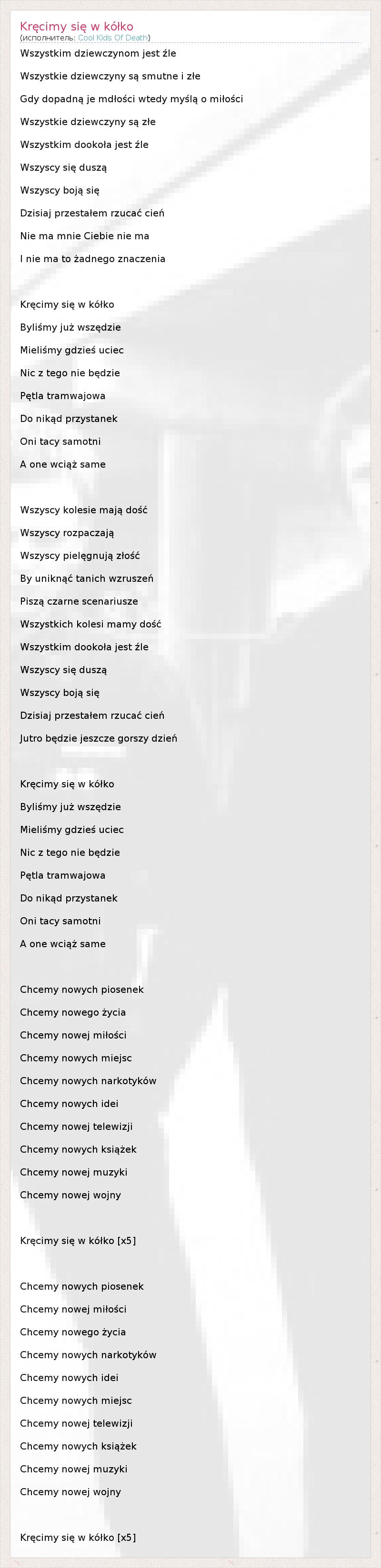 Wszystkim dziewczynom jest źle Wszystkie dziewczyny są smutne i złe Gdy dopadną je mdłości wtedy myślą o miłości Wszystkie dziewczyny są złe Wszystkim dookoła jest źle Wszyscy się duszą Wszyscy boją się Dzisiaj przestałem rzucać cień Nie ma mnie Ciebie nie ma I nie ma to żadnego znaczenia Kręcimy się w kółko Byliśmy już wszędzie Mieliśmy gdzieś uciec Nic z tego nie będzie Pętla tramwajowa Do nikąd przystanek Oni tacy samotni A one wciąż same Wszyscy kolesie mają dość Wszyscy rozpaczają Wszyscy pielęgnują złość By uniknąć tanich wzruszeń Piszą czarne scenariusze Wszystkich kolesi mamy dość Wszystkim dookoła jest źle Wszyscy się duszą Wszyscy boją się Dzisiaj przestałem rzucać cień Jutro będzie jeszcze gorszy dzień Kręcimy się w kółko Byliśmy już wszędzie Mieliśmy gdzieś uciec Nic z tego nie będzie Pętla tramwajowa Do nikąd przystanek Oni tacy samotni A one wciąż same Chcemy nowych piosenek Chcemy nowego życia Chcemy nowej miłości Chcemy nowych miejsc Chcemy nowych narkotyków Chcemy nowych idei Chcemy nowej telewizji Chcemy nowych książek Chcemy nowej muzyki Chcemy nowej wojny Kręcimy się w kółko [x5] Chcemy nowych piosenek Chcemy nowej miłości Chcemy nowego życia Chcemy nowych narkotyków Chcemy nowych idei Chcemy nowych miejsc Chcemy nowej telewizji Chcemy nowych książek Chcemy nowej muzyki Chcemy nowej wojny Kręcimy się w kółko [x5]