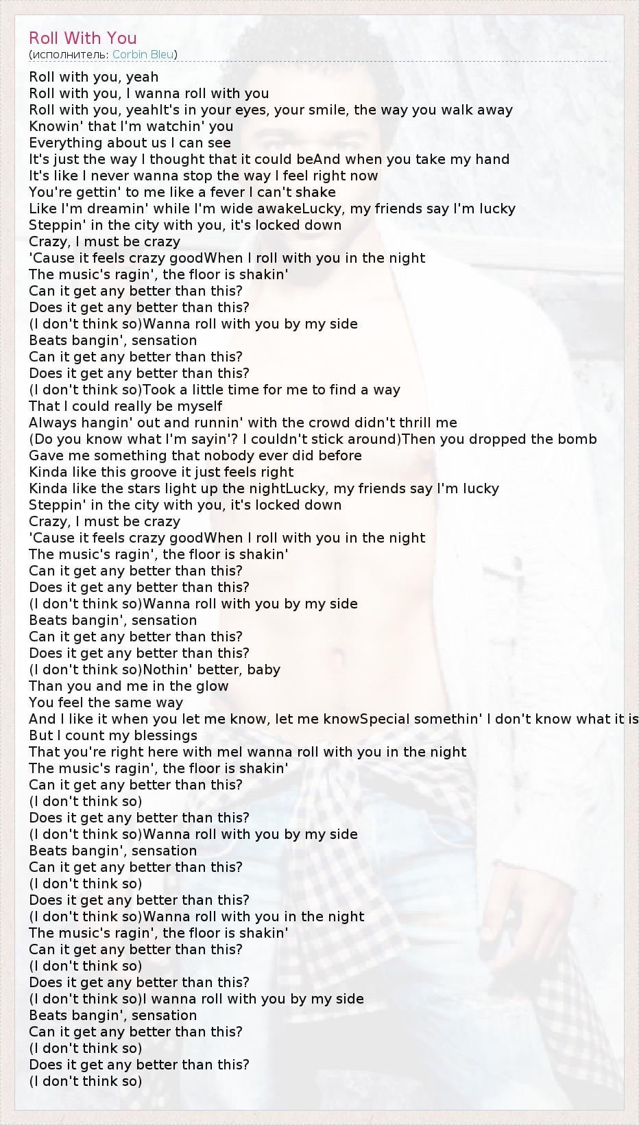 Roll with you, yeah Roll with you, I wanna roll with you Roll with you, yeahIt's in your eyes, your smile, the way you walk away Knowin' that I'm watchin' you Everything about us I can see It's just the way I thought that it could beAnd when you take my hand It's like I never wanna stop the way I feel right now You're gettin' to me like a fever I can't shake Like I'm dreamin' while I'm wide awakeLucky, my friends say I'm lucky Steppin' in the city with you, it's locked down Crazy, I must be crazy 'Cause it feels crazy goodWhen I roll with you in the night The music's ragin', the floor is shakin' Can it get any better than this? Does it get any better than this? (I don't think so)Wanna roll with you by my side Beats bangin', sensation Can it get any better than this? Does it get any better than this? (I don't think so)Took a little time for me to find a way That I could really be myself Always hangin' out and runnin' with the crowd didn't thrill me (Do you know what I'm sayin'? I couldn't stick around)Then you dropped the bomb Gave me something that nobody ever did before Kinda like this groove it just feels right Kinda like the stars light up the nightLucky, my friends say I'm lucky Steppin' in the city with you, it's locked down Crazy, I must be crazy 'Cause it feels crazy goodWhen I roll with you in the night The music's ragin', the floor is shakin' Can it get any better than this? Does it get any better than this? (I don't think so)Wanna roll with you by my side Beats bangin', sensation Can it get any better than this? Does it get any better than this? (I don't think so)Nothin' better, baby Than you and me in the glow You feel the same way And I like it when you let me know, let me knowSpecial somethin' I don't know what it is But I count my blessings That you're right here with meI wanna roll with you in the night The music's ragin', the floor is shakin' Can it get any better than this? (I don't think so) Does it get any better than this? (I don't think so)Wanna roll with you by my side Beats bangin', sensation Can it get any better than this? (I don't think so) Does it get any better than this? (I don't think so)Wanna roll with you in the night The music's ragin', the floor is shakin' Can it get any better than this? (I don't think so) Does it get any better than this? (I don't think so)I wanna roll with you by my side Beats bangin', sensation Can it get any better than this? (I don't think so) Does it get any better than this? (I don't think so)