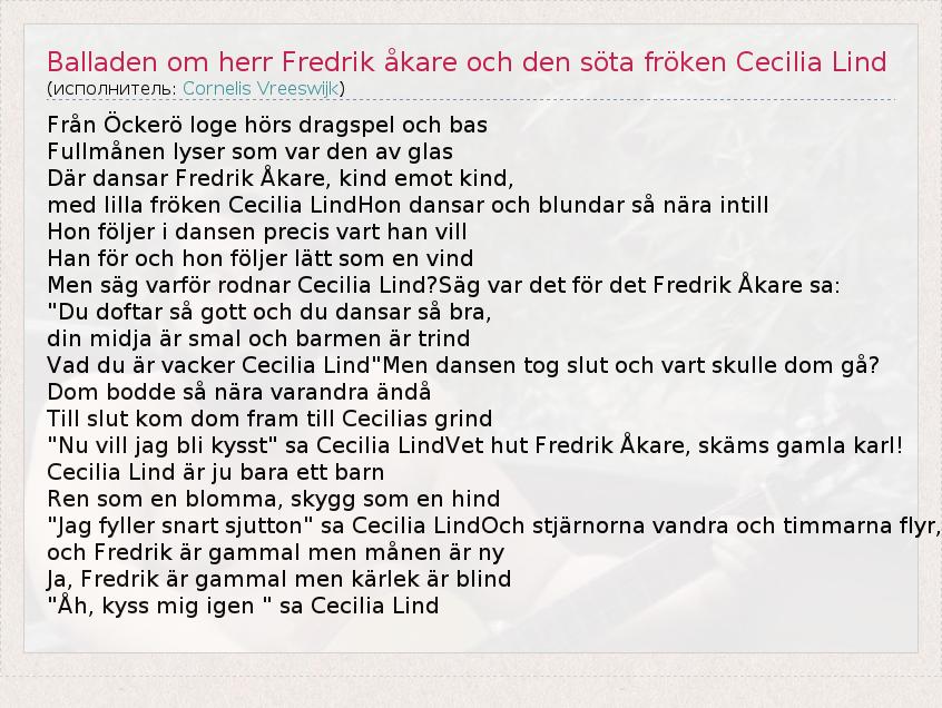 А как ты думаешь, о чем песня "Balladen om herr Fredrik åkare och den söta fröken Cecilia Lind" ?