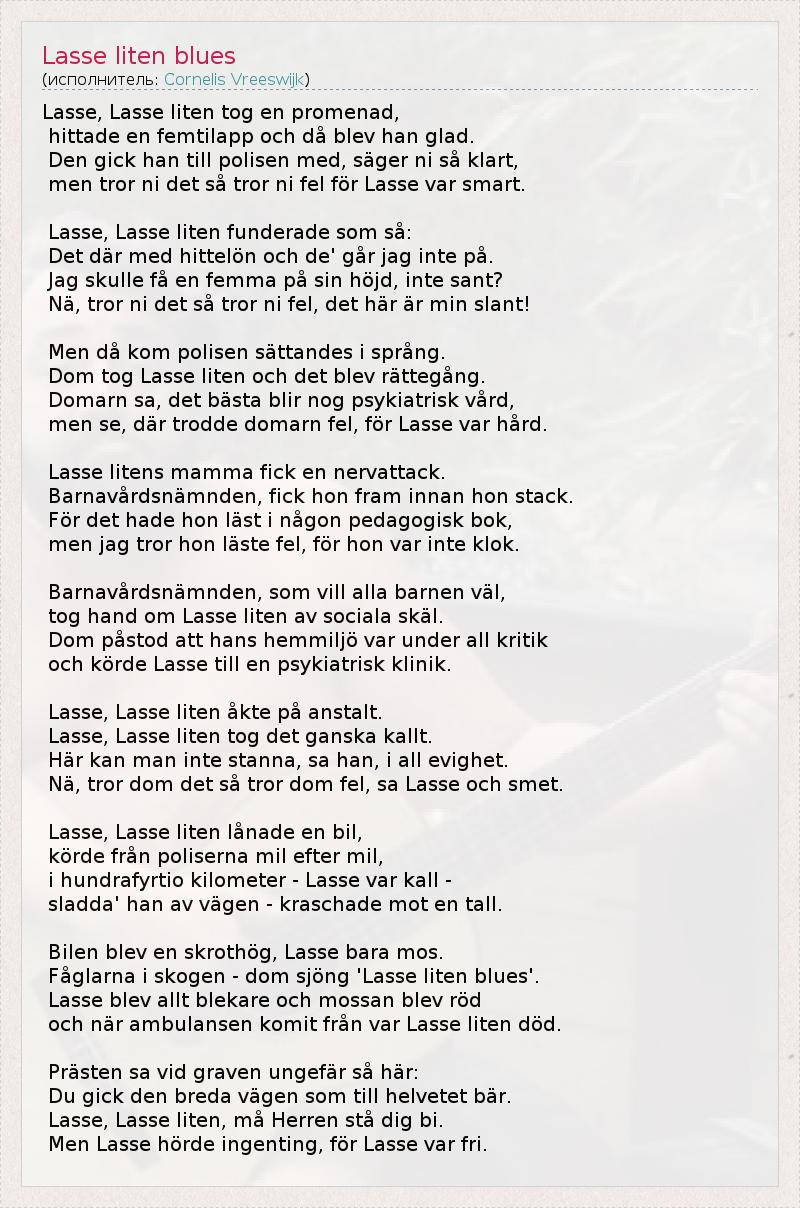 Лассе, Лассе LITEN щегольски ан Променад, hittade ан femtilapp оч-да-blev хан рад. Ден gick хан до polisen мед, Sager п så klart, мужчины Tror п Det så Tror И. Фельдманом för Лассе вар умный. Лассе, Лассе Liteň funderade сом SA: Det Dar Med hittelön оч де 'går Jag ин ПА. Зубец skulle FA ан femma på грех höjd, ин сант? Na, Ni Tror Det så Tror И. Фельдманом, Det är här мин наклонной! Мужчины-да-ком polisen sättandes я вскочил. Дом щегольски Лассе LITEN оч Det blev rättegång. Domarn са, Det Bästa blir Ног psykiatrisk Вард, мужчины сути, Dar trodde domarn Скверны, за Лассе вар трудно. Лассе litens мама Фик ан nervattack. Barnavårdsnämnden, Фик дорогая Фрам innan хон стека. För Det мастерил дорогая Последнее, что я någon pedagogisk бок, мужчины Jag Tror дорогая Laste Скверны, для Hon вар ин Клок. Barnavårdsnämnden, сом пос Алла Барнен Val, щегольски рука ом Лассе LITEN пр Sociala Skal. Дом påstod Att куры hemmiljö вар под всем Kritik оч Korde Лассе до ванной psykiatrisk Клиника. Лассе, Лассе Liteň Akte på Anstalt. Лассе, Лассе Liteň тог Det ganska kallt. Хар кан человек ин stanna, SA хан, я все evighet. Na, Tror дом Det så Tror дом Скверны, SA Лассе оч Смет. Лассе, Лассе LITEN lånade ан млрд, Korde От poliserna млн Efter млн, я hundrafyrtio километр - Лассе уаг калл - sladda 'хан пр Vagen - kraschade словцо ан высотой. Bilen blev ан skrothög, Лассе ата мес. Fåglarna я Skogen - Дом sjöng 'Лассе Liteň блюз ". Лассе blev Allt blekare оч mossan blev стержня оч Nar ambulansen komit От вар Лассе LITEN Дод. Prästen са VID начертанные ungefär så här: Ду gick ден Бреда Vagen сомов до helvetet бар. Лассе, Лассе LITEN, Ма Herren ГНА копать би. Мужчины Лассе Орды Ingenting, за Лассе вар Пт