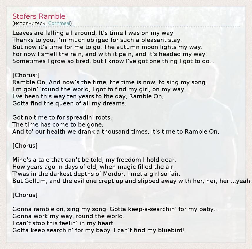 Gonna ramble on, sing my song. Gotta keep-a-searchin' for my baby...