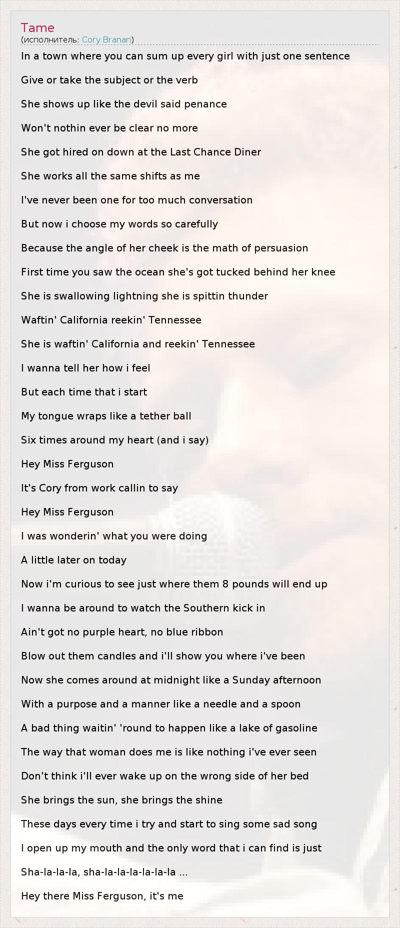In a town where you can sum up every girl with just one sentence Give or take the subject or the verb She shows up like the devil said penance Won't nothin ever be clear no more She got hired on down at the Last Chance Diner She works all the same shifts as me I've never been one for too much conversation But now i choose my words so carefully Because the angle of her cheek is the math of persuasion First time you saw the ocean she's got tucked behind her knee She is swallowing lightning she is spittin thunder Waftin' California reekin' Tennessee She is waftin' California and reekin' Tennessee I wanna tell her how i feel But each time that i start My tongue wraps like a tether ball Six times around my heart (and i say) Hey Miss Ferguson It's Cory from work callin to say Hey Miss Ferguson I was wonderin' what you were doing A little later on today Now i'm curious to see just where them 8 pounds will end up I wanna be around to watch the Southern kick in Ain't got no purple heart, no blue ribbon Blow out them candles and i'll show you where i've been Now she comes around at midnight like a Sunday afternoon With a purpose and a manner like a needle and a spoon A bad thing waitin' 'round to happen like a lake of gasoline The way that woman does me is like nothing i've ever seen Don't think i'll ever wake up on the wrong side of her bed She brings the sun, she brings the shine These days every time i try and start to sing some sad song I open up my mouth and the only word that i can find is just Sha-la-la-la, sha-la-la-la-la-la-la ... Hey there Miss Ferguson, it's me