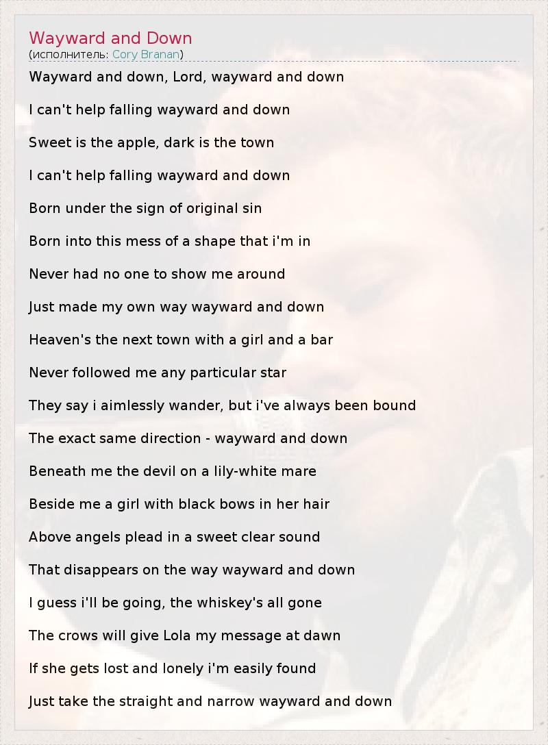 Wayward and down, Lord, wayward and down I can't help falling wayward and down Sweet is the apple, dark is the town I can't help falling wayward and down Born under the sign of original sin Born into this mess of a shape that i'm in Never had no one to show me around Just made my own way wayward and down Heaven's the next town with a girl and a bar Never followed me any particular star They say i aimlessly wander, but i've always been bound The exact same direction - wayward and down Beneath me the devil on a lily-white mare Beside me a girl with black bows in her hair Above angels plead in a sweet clear sound That disappears on the way wayward and down I guess i'll be going, the whiskey's all gone The crows will give Lola my message at dawn If she gets lost and lonely i'm easily found Just take the straight and narrow wayward and down