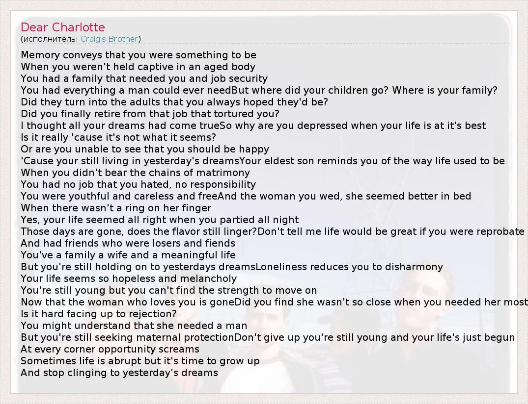 А как ты думаешь, о чем песня "Dear Charlotte" ?