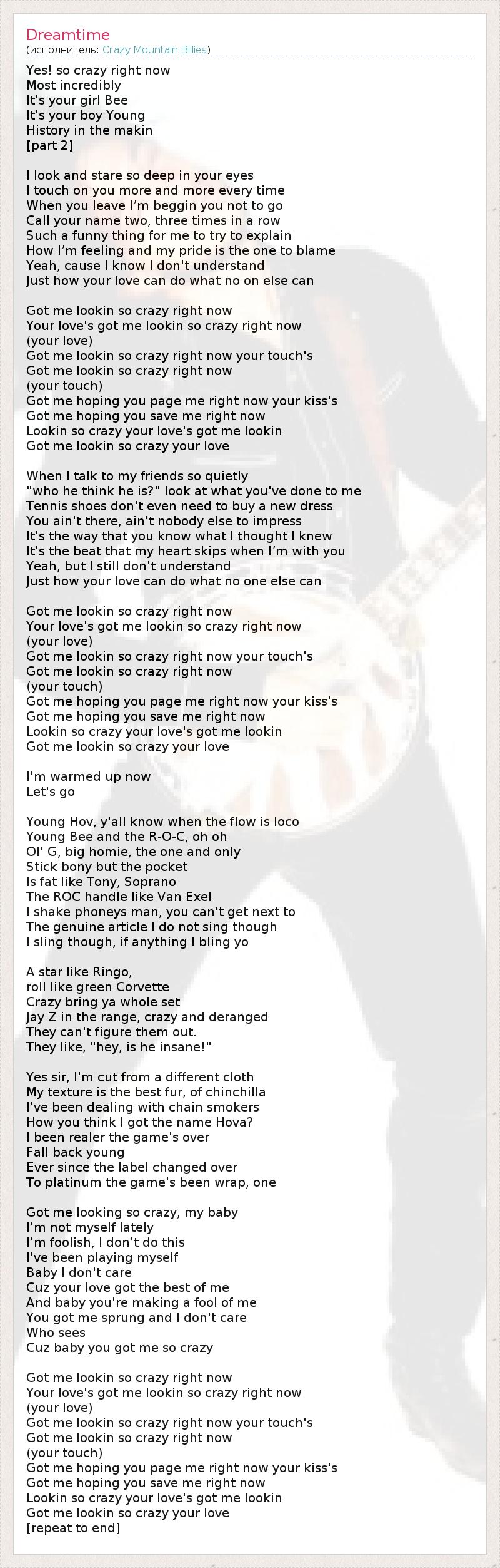 Yes! so crazy right now Most incredibly It's your girl Bee It's your boy Young History in the makin [part 2] I look and stare so deep in your eyes I touch on you more and more every time When you leave I’m beggin you not to go Call your name two, three times in a row Such a funny thing for me to try to explain How I’m feeling and my pride is the one to blame Yeah, cause I know I don't understand Just how your love can do what no on else can Got me lookin so crazy right now Your love's got me lookin so crazy right now (your love) Got me lookin so crazy right now your touch's Got me lookin so crazy right now (your touch) Got me hoping you page me right now your kiss's Got me hoping you save me right now Lookin so crazy your love's got me lookin Got me lookin so crazy your love When I talk to my friends so quietly "who he think he is?" look at what you've done to me Tennis shoes don't even need to buy a new dress You ain't there, ain't nobody else to impress It's the way that you know what I thought I knew It's the beat that my heart skips when I’m with you Yeah, but I still don't understand Just how your love can do what no one else can Got me lookin so crazy right now Your love's got me lookin so crazy right now (your love) Got me lookin so crazy right now your touch's Got me lookin so crazy right now (your touch) Got me hoping you page me right now your kiss's Got me hoping you save me right now Lookin so crazy your love's got me lookin Got me lookin so crazy your love I'm warmed up now Let's go Young Hov, y'all know when the flow is loco Young Bee and the R-O-C, oh oh Ol' G, big homie, the one and only Stick bony but the pocket Is fat like Tony, Soprano The ROC handle like Van Exel I shake phoneys man, you can't get next to The genuine article I do not sing though I sling though, if anything I bling yo A star like Ringo, roll like green Corvette Crazy bring ya whole set Jay Z in the range, crazy and deranged They can't figure them out. They like, "hey, is he insane!" Yes sir, I'm cut from a different cloth My texture is the best fur, of chinchilla I've been dealing with chain smokers How you think I got the name Hova? I been realer the game's over Fall back young Ever since the label changed over To platinum the game's been wrap, one Got me looking so crazy, my baby I'm not myself lately I'm foolish, I don't do this I've been playing myself Baby I don't care Cuz your love got the best of me And baby you're making a fool of me You got me sprung and I don't care Who sees Cuz baby you got me so crazy Got me lookin so crazy right now Your love's got me lookin so crazy right now (your love) Got me lookin so crazy right now your touch's Got me lookin so crazy right now (your touch) Got me hoping you page me right now your kiss's Got me hoping you save me right now Lookin so crazy your love's got me lookin Got me lookin so crazy your love [repeat to end]