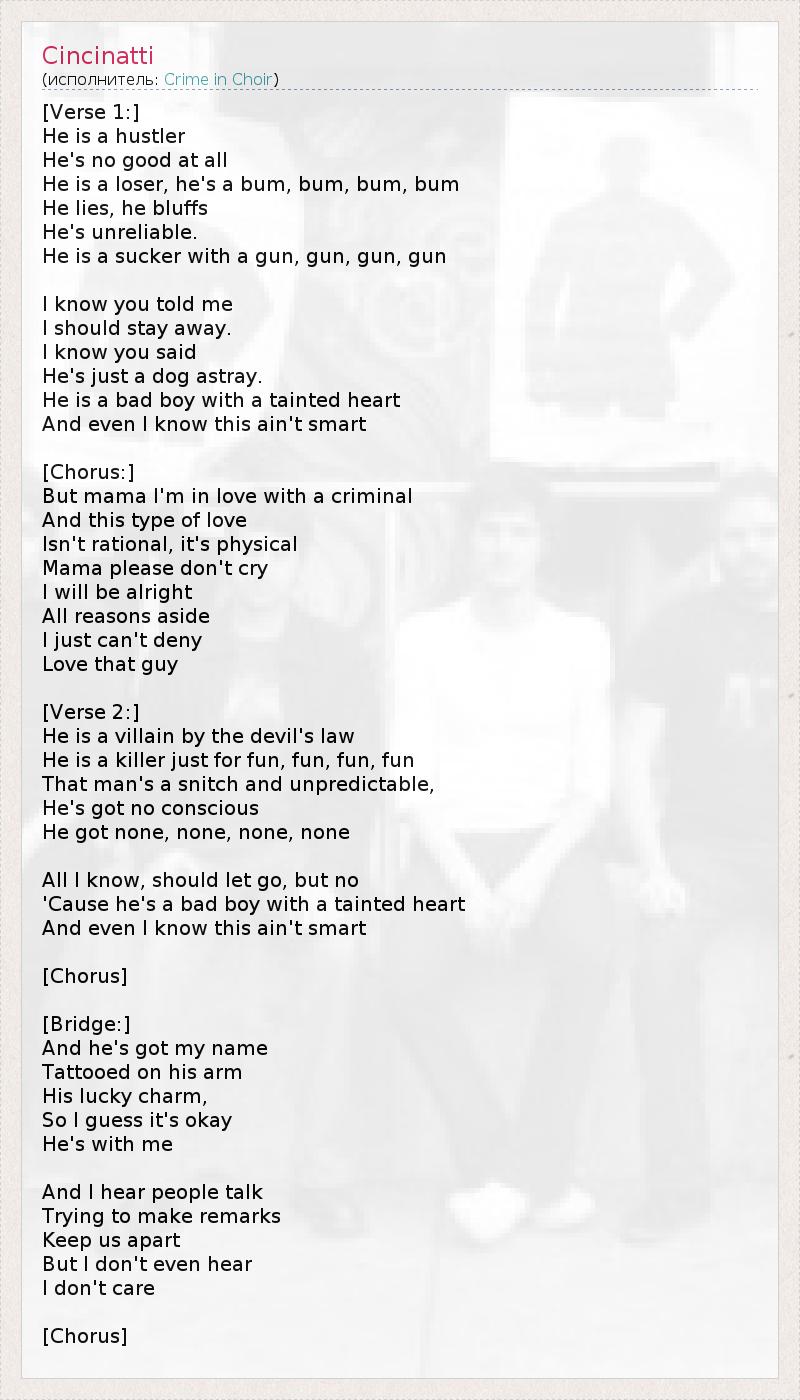 [Куплет 1:] Он – жулик, Он никуда не годится. Он – неудачник, никчёмный человек. Он лжет, он блефует, Он ненадежный, Он неудачник с пистолетом. Я знаю, ты говорила мне, Что мне нужно держаться от него подальше. Я знаю, ты говорила, Что он просто заблудший пёс. Он – плохой парень с порочным сердцем, И даже я знаю, что это глупо. [Припев:] Но, мама, я влюблена в преступника, И эта любовь Неподвластна разуму, это физическое. Мама, пожалуйста, не плачь, Со мной все будет хорошо. Все доводы прочь, Я не могу отрицать, что Люблю этого парня. [Куплет 2:] Он - злодей дьявольского закона, Он - убийца только для забавы. Он стукач и непредсказуем, Он ничего не сознаёт, Нет, нет, нет... Я знаю лишь, что должна забыть его, но нет... Ведь он плохой парень с порочным сердцем, И даже я знаю, что это глупо... [Припев] [Переход:] И у него есть тату С моим на именем на руке - Его талисман, Поэтому, думаю, это нормально, Что мы вместе. Я слышу, что говорят другие, Пытаясь делать замечания, Чтобы разлучить нас. Но я даже не слышу их, Мне пофиг... [Припев]