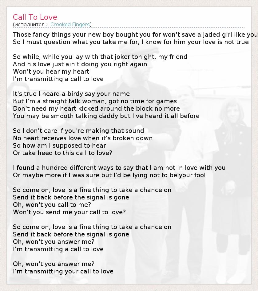Those fancy things your new boy bought you for won't save a jaded girl like you So I must question what you take me for, I know for him your love is not true So while, while you lay with that joker tonight, my friend And his love just ain't doing you right again Won't you hear my heart I'm transmitting a call to love It's true I heard a birdy say your name But I'm a straight talk woman, got no time for games Don't need my heart kicked around the block no more You may be smooth talking daddy but I've heard it all before So I don't care if you're making that sound No heart receives love when it's broken down So how am I supposed to hear Or take heed to this call to love? I found a hundred different ways to say that I am not in love with you Or maybe more if I was sure but I'd be lying not to be your fool So come on, love is a fine thing to take a chance on Send it back before the signal is gone Oh, won't you call to me? Won't you send me your call to love? So come on, love is a fine thing to take a chance on Send it back before the signal is gone Oh, won't you answer me? I'm transmitting a call to love Oh, won't you answer me? I'm transmitting your call to love