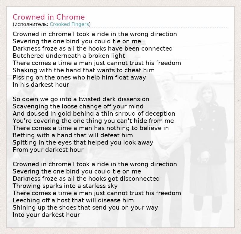 Crowned in chrome I took a ride in the wrong direction Severing the one bind you could tie on me Darkness froze as all the hooks have been connected Butchered underneath a broken light There comes a time a man just cannot trust his freedom Shaking with the hand that wants to cheat him Pissing on the ones who help him float away In his darkest hour So down we go into a twisted dark dissension Scavenging the loose change off your mind And doused in gold behind a thin shroud of deception You're covering the one thing you can't hide from me There comes a time a man has nothing to believe in Betting with a hand that will defeat him Spitting in the eyes that helped you look away From your darkest hour Crowned in chrome I took a ride in the wrong direction Severing the one bind you could tie on me Darkness froze as all the hooks got disconnected Throwing sparks into a starless sky There comes a time a man just cannot trust his freedom Leeching off a host that will disease him Shining up the shoes that send you on your way Into your darkest hour