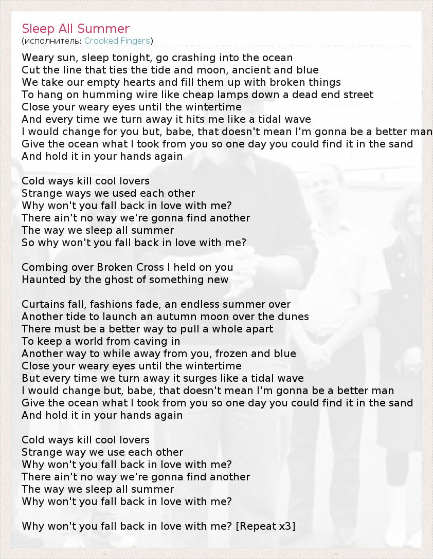 Weary sun, sleep tonight, go crashing into the ocean Cut the line that ties the tide and moon, ancient and blue We take our empty hearts and fill them up with broken things To hang on humming wire like cheap lamps down a dead end street Close your weary eyes until the wintertime And every time we turn away it hits me like a tidal wave I would change for you but, babe, that doesn't mean I'm gonna be a better man Give the ocean what I took from you so one day you could find it in the sand And hold it in your hands again Cold ways kill cool lovers Strange ways we used each other Why won't you fall back in love with me? There ain't no way we're gonna find another The way we sleep all summer So why won't you fall back in love with me? Combing over Broken Cross I held on you Haunted by the ghost of something new Curtains fall, fashions fade, an endless summer over Another tide to launch an autumn moon over the dunes There must be a better way to pull a whole apart To keep a world from caving in Another way to while away from you, frozen and blue Close your weary eyes until the wintertime But every time we turn away it surges like a tidal wave I would change but, babe, that doesn't mean I'm gonna be a better man Give the ocean what I took from you so one day you could find it in the sand And hold it in your hands again Cold ways kill cool lovers Strange way we use each other Why won't you fall back in love with me? There ain't no way we're gonna find another The way we sleep all summer Why won't you fall back in love with me? Why won't you fall back in love with me? [Repeat x3]