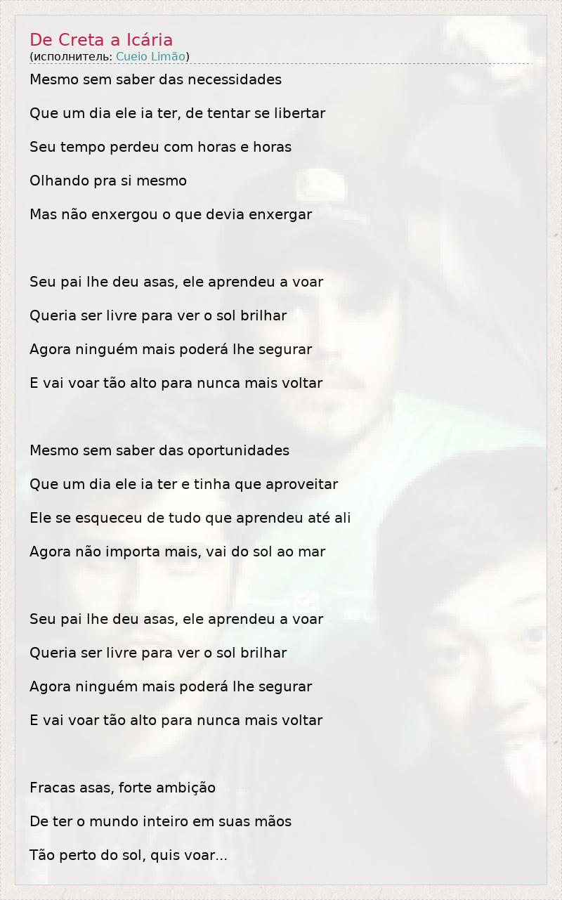 Mesmo sem saber das necessidades Que um dia ele ia ter, de tentar se libertar Seu tempo perdeu com horas e horas Olhando pra si mesmo Mas não enxergou o que devia enxergar Seu pai lhe deu asas, ele aprendeu a voar Queria ser livre para ver o sol brilhar Agora ninguém mais poderá lhe segurar E vai voar tão alto para nunca mais voltar Mesmo sem saber das oportunidades Que um dia ele ia ter e tinha que aproveitar Ele se esqueceu de tudo que aprendeu até ali Agora não importa mais, vai do sol ao mar Seu pai lhe deu asas, ele aprendeu a voar Queria ser livre para ver o sol brilhar Agora ninguém mais poderá lhe segurar E vai voar tão alto para nunca mais voltar Fracas asas, forte ambição De ter o mundo inteiro em suas mãos Tão perto do sol, quis voar...