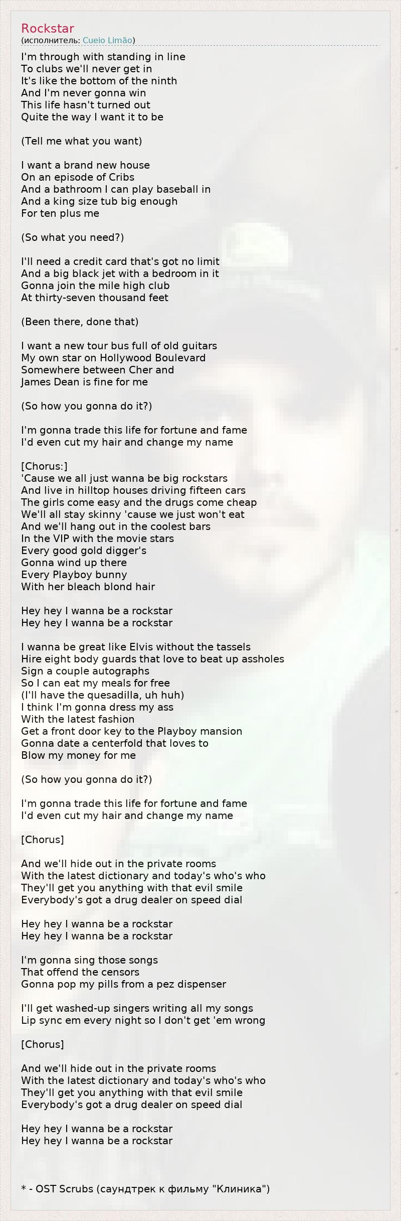 I'm through with standing in line To clubs we'll never get in It's like the bottom of the ninth And I'm never gonna win This life hasn't turned out Quite the way I want it to be (Tell me what you want) I want a brand new house On an episode of Cribs And a bathroom I can play baseball in And a king size tub big enough For ten plus me (So what you need?) I'll need a credit card that's got no limit And a big black jet with a bedroom in it Gonna join the mile high club At thirty-seven thousand feet (Been there, done that) I want a new tour bus full of old guitars My own star on Hollywood Boulevard Somewhere between Cher and James Dean is fine for me (So how you gonna do it?) I'm gonna trade this life for fortune and fame I'd even cut my hair and change my name [Chorus:] 'Cause we all just wanna be big rockstars And live in hilltop houses driving fifteen cars The girls come easy and the drugs come cheap We'll all stay skinny 'cause we just won't eat And we'll hang out in the coolest bars In the VIP with the movie stars Every good gold digger's Gonna wind up there Every Playboy bunny With her bleach blond hair Hey hey I wanna be a rockstar Hey hey I wanna be a rockstar I wanna be great like Elvis without the tassels Hire eight body guards that love to beat up assholes Sign a couple autographs So I can eat my meals for free (I'll have the quesadilla, uh huh) I think I'm gonna dress my ass With the latest fashion Get a front door key to the Playboy mansion Gonna date a centerfold that loves to Blow my money for me (So how you gonna do it?) I'm gonna trade this life for fortune and fame I'd even cut my hair and change my name [Chorus] And we'll hide out in the private rooms With the latest dictionary and today's who's who They'll get you anything with that evil smile Everybody's got a drug dealer on speed dial Hey hey I wanna be a rockstar Hey hey I wanna be a rockstar I'm gonna sing those songs That offend the censors Gonna pop my pills from a pez dispenser I'll get washed-up singers writing all my songs Lip sync em every night so I don't get 'em wrong [Chorus] And we'll hide out in the private rooms With the latest dictionary and today's who's who They'll get you anything with that evil smile Everybody's got a drug dealer on speed dial Hey hey I wanna be a rockstar Hey hey I wanna be a rockstar * - OST Scrubs (саундтрек к фильму "Клиника")