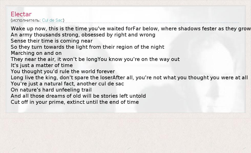 Это интересно:Музыка Cul de Sac в чем-то сродни простому, красивому и изящному решению сложнейшей математической задачи. Звуки, как бы налипают один к другому, образуя невообразимо запутанную, притягательную, интригующую и при этом очень логичную цепь. Их творчество — это увлекательное путешествие мозга по удивительным лабиринтам под и над сознания. Подчас даже пугающее или грустное путешествие, но всегда... продолжение