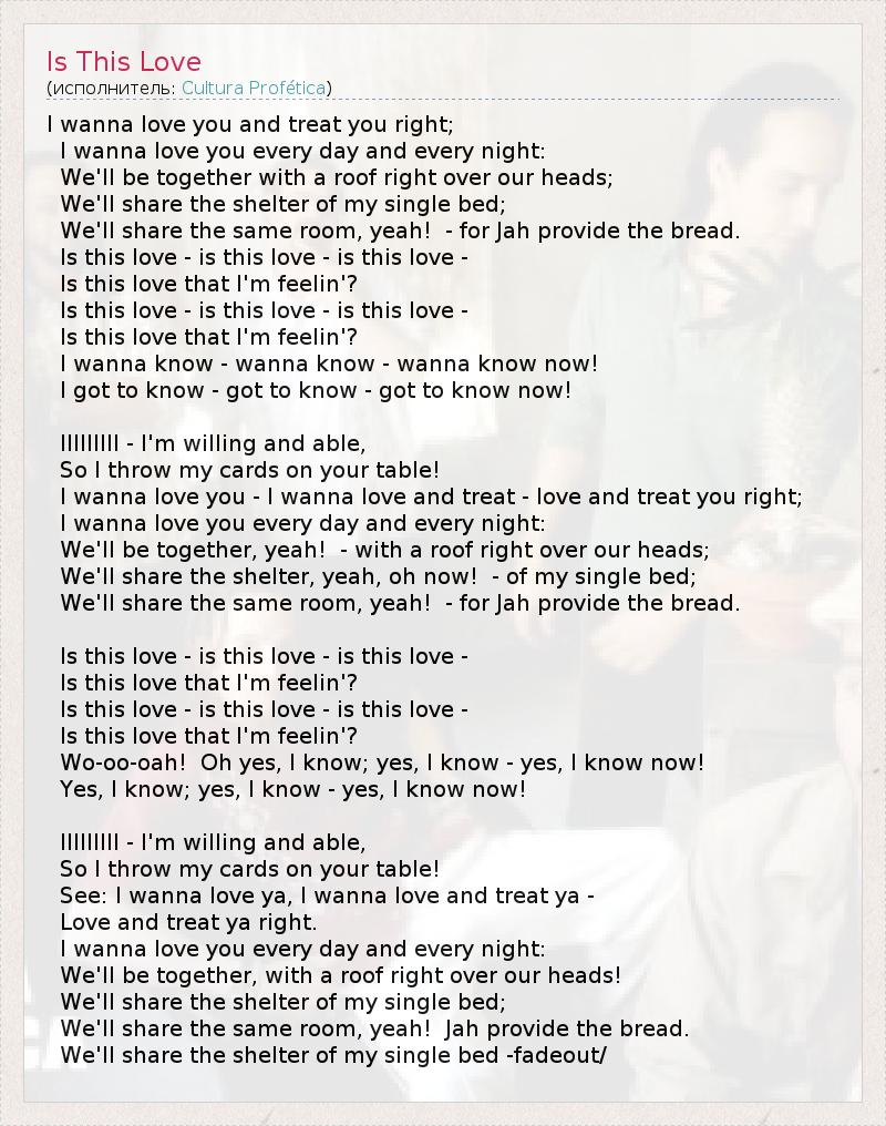 I wanna love you and treat you right; I wanna love you every day and every night: We'll be together with a roof right over our heads; We'll share the shelter of my single bed; We'll share the same room, yeah! - for Jah provide the bread. Is this love - is this love - is this love - Is this love that I'm feelin'? Is this love - is this love - is this love - Is this love that I'm feelin'? I wanna know - wanna know - wanna know now! I got to know - got to know - got to know now! IIIIIIIII - I'm willing and able, So I throw my cards on your table! I wanna love you - I wanna love and treat - love and treat you right; I wanna love you every day and every night: We'll be together, yeah! - with a roof right over our heads; We'll share the shelter, yeah, oh now! - of my single bed; We'll share the same room, yeah! - for Jah provide the bread. Is this love - is this love - is this love - Is this love that I'm feelin'? Is this love - is this love - is this love - Is this love that I'm feelin'? Wo-oo-oah! Oh yes, I know; yes, I know - yes, I know now! Yes, I know; yes, I know - yes, I know now! IIIIIIIII - I'm willing and able, So I throw my cards on your table! See: I wanna love ya, I wanna love and treat ya - Love and treat ya right. I wanna love you every day and every night: We'll be together, with a roof right over our heads! We'll share the shelter of my single bed; We'll share the same room, yeah! Jah provide the bread. We'll share the shelter of my single bed -fadeout/