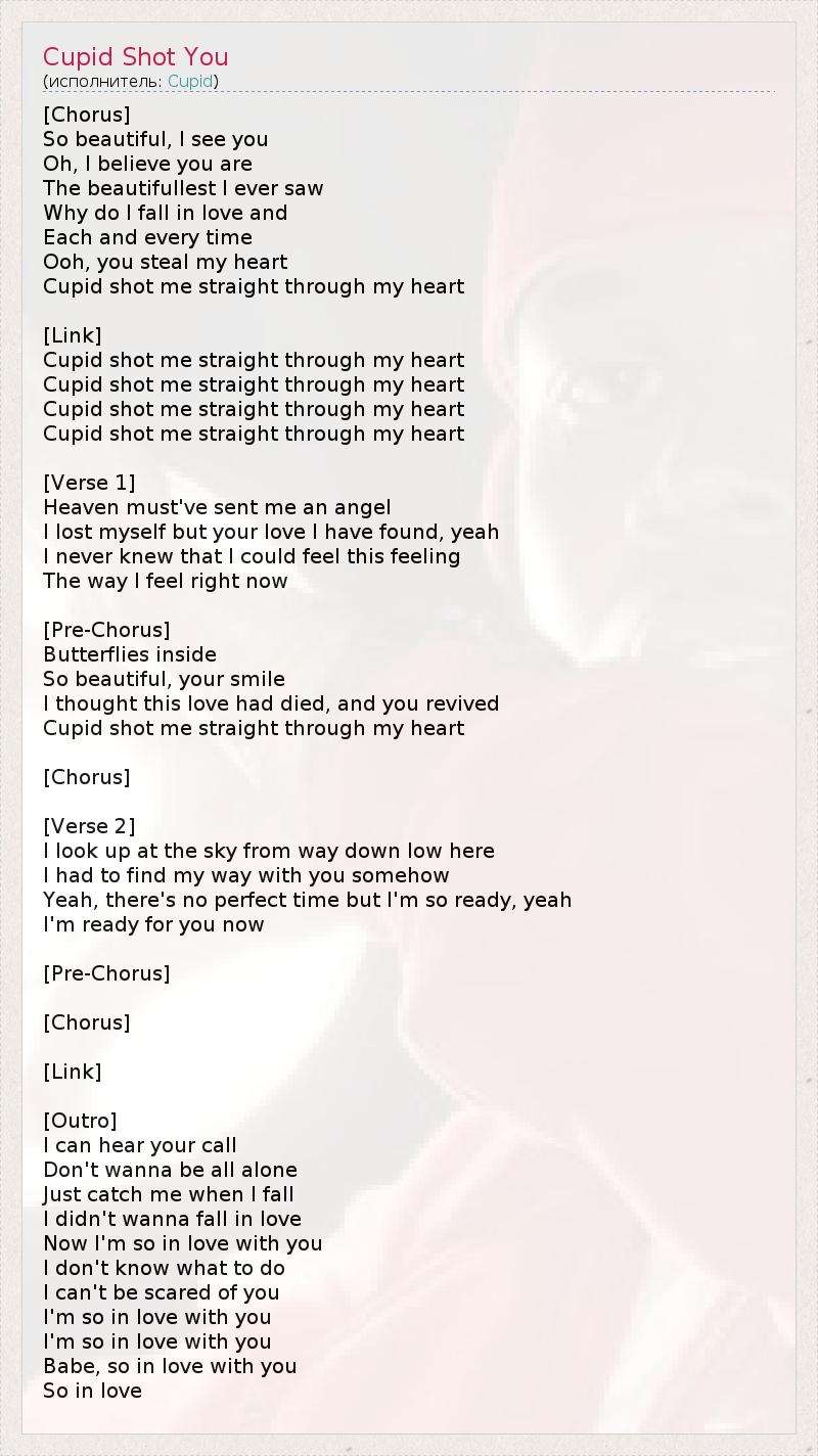 [Chorus] So beautiful, I see you Oh, I believe you are The beautifullest I ever saw Why do I fall in love and Each and every time Ooh, you steal my heart Cupid shot me straight through my heart [Link] Cupid shot me straight through my heart Cupid shot me straight through my heart Cupid shot me straight through my heart Cupid shot me straight through my heart [Verse 1] Heaven must've sent me an angel I lost myself but your love I have found, yeah I never knew that I could feel this feeling The way I feel right now [Pre-Chorus] Butterflies inside So beautiful, your smile I thought this love had died, and you revived Cupid shot me straight through my heart [Chorus] [Verse 2] I look up at the sky from way down low here I had to find my way with you somehow Yeah, there's no perfect time but I'm so ready, yeah I'm ready for you now [Pre-Chorus] [Chorus] [Link] [Outro] I can hear your call Don't wanna be all alone Just catch me when I fall I didn't wanna fall in love Now I'm so in love with you I don't know what to do I can't be scared of you I'm so in love with you I'm so in love with you Babe, so in love with you So in love