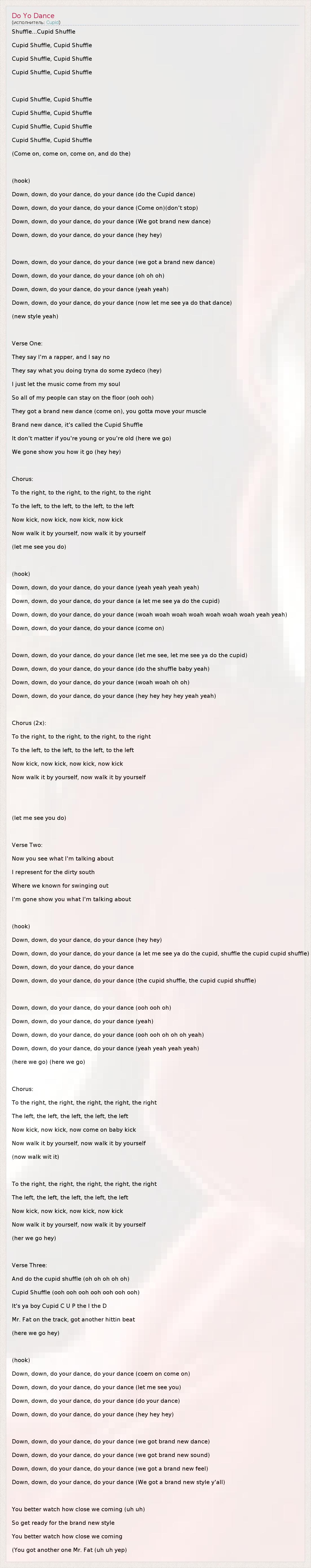 Shuffle...Cupid Shuffle Cupid Shuffle, Cupid Shuffle Cupid Shuffle, Cupid Shuffle Cupid Shuffle, Cupid Shuffle Cupid Shuffle, Cupid Shuffle Cupid Shuffle, Cupid Shuffle Cupid Shuffle, Cupid Shuffle Cupid Shuffle, Cupid Shuffle (Come on, come on, come on, and do the) (hook) Down, down, do your dance, do your dance (do the Cupid dance) Down, down, do your dance, do your dance (Come on)(don't stop) Down, down, do your dance, do your dance (We got brand new dance) Down, down, do your dance, do your dance (hey hey) Down, down, do your dance, do your dance (we got a brand new dance) Down, down, do your dance, do your dance (oh oh oh) Down, down, do your dance, do your dance (yeah yeah) Down, down, do your dance, do your dance (now let me see ya do that dance) (new style yeah) Verse One: They say I'm a rapper, and I say no They say what you doing tryna do some zydeco (hey) I just let the music come from my soul So all of my people can stay on the floor (ooh ooh) They got a brand new dance (come on), you gotta move your muscle Brand new dance, it's called the Cupid Shuffle It don't matter if you're young or you're old (here we go) We gone show you how it go (hey hey) Chorus: To the right, to the right, to the right, to the right To the left, to the left, to the left, to the left Now kick, now kick, now kick, now kick Now walk it by yourself, now walk it by yourself (let me see you do) (hook) Down, down, do your dance, do your dance (yeah yeah yeah yeah) Down, down, do your dance, do your dance (a let me see ya do the cupid) Down, down, do your dance, do your dance (woah woah woah woah woah woah woah yeah yeah) Down, down, do your dance, do your dance (come on) Down, down, do your dance, do your dance (let me see, let me see ya do the cupid) Down, down, do your dance, do your dance (do the shuffle baby yeah) Down, down, do your dance, do your dance (woah woah oh oh) Down, down, do your dance, do your dance (hey hey hey hey yeah yeah) Chorus (2x): To the right, to the right, to the right, to the right To the left, to the left, to the left, to the left Now kick, now kick, now kick, now kick Now walk it by yourself, now walk it by yourself (let me see you do) Verse Two: Now you see what I'm talking about I represent for the dirty south Where we known for swinging out I'm gone show you what I'm talking about (hook) Down, down, do your dance, do your dance (hey hey) Down, down, do your dance, do your dance (a let me see ya do the cupid, shuffle the cupid cupid shuffle) Down, down, do your dance, do your dance Down, down, do your dance, do your dance (the cupid shuffle, the cupid cupid shuffle) Down, down, do your dance, do your dance (ooh ooh oh) Down, down, do your dance, do your dance (yeah) Down, down, do your dance, do your dance (ooh ooh oh oh oh yeah) Down, down, do your dance, do your dance (yeah yeah yeah yeah) (here we go) (here we go) Chorus: To the right, the right, the right, the right, the right The left, the left, the left, the left, the left Now kick, now kick, now come on baby kick Now walk it by yourself, now walk it by yourself (now walk wit it) To the right, the right, the right, the right, the right The left, the left, the left, the left, the left Now kick, now kick, now kick, now kick Now walk it by yourself, now walk it by yourself (her we go hey) Verse Three: And do the cupid shuffle (oh oh oh oh oh) Cupid Shuffle (ooh ooh ooh ooh ooh ooh ooh) It's ya boy Cupid C U P the I the D Mr. Fat on the track, got another hittin beat (here we go hey) (hook) Down, down, do your dance, do your dance (coem on come on) Down, down, do your dance, do your dance (let me see you) Down, down, do your dance, do your dance (do your dance) Down, down, do your dance, do your dance (hey hey hey) Down, down, do your dance, do your dance (we got brand new dance) Down, down, do your dance, do your dance (we got brand new sound) Down, down, do your dance, do your dance (we got a brand new feel) Down, down, do your dance, do your dance (We got a brand new style y'all) You better watch how close we coming (uh uh) So get ready for the brand new style You better watch how close we coming (You got another one Mr. Fat (uh uh yep)