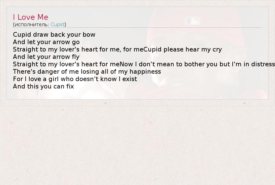 Cupid draw back your bow And let your arrow go Straight to my lover's heart for me, for meCupid please hear my cry And let your arrow fly Straight to my lover's heart for meNow I don't mean to bother you but I'm in distress There's danger of me losing all of my happiness For I love a girl who doesn't know I exist And this you can fix