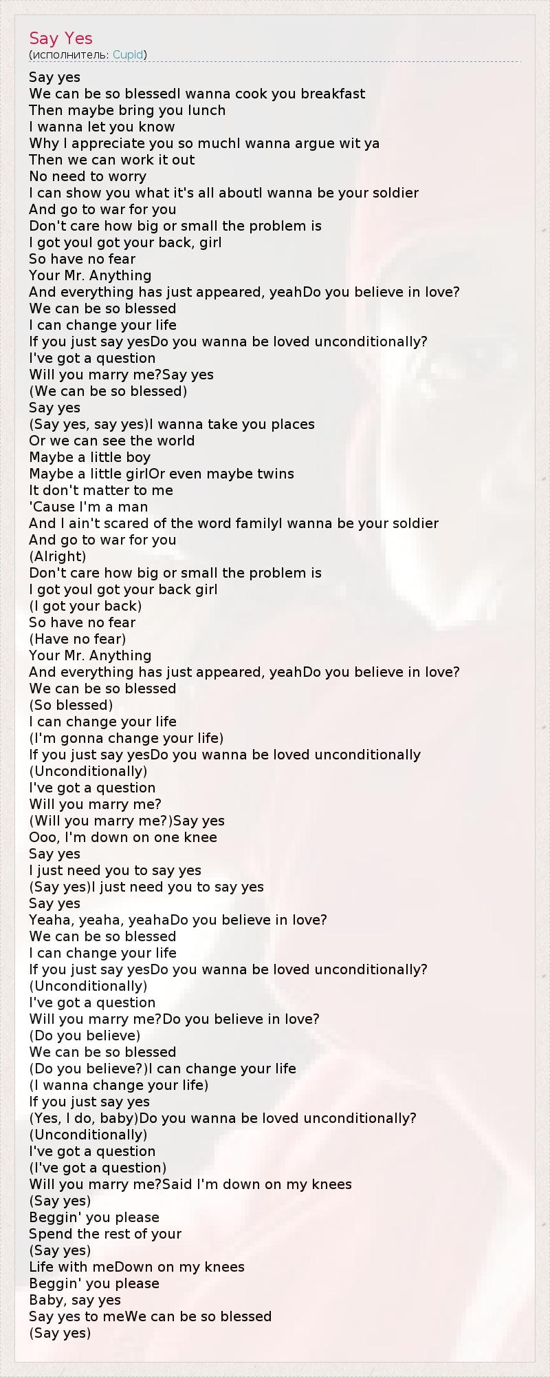 Say yes We can be so blessedI wanna cook you breakfast Then maybe bring you lunch I wanna let you know Why I appreciate you so muchI wanna argue wit ya Then we can work it out No need to worry I can show you what it's all aboutI wanna be your soldier And go to war for you Don't care how big or small the problem is I got youI got your back, girl So have no fear Your Mr. Anything And everything has just appeared, yeahDo you believe in love? We can be so blessed I can change your life If you just say yesDo you wanna be loved unconditionally? I've got a question Will you marry me?Say yes (We can be so blessed) Say yes (Say yes, say yes)I wanna take you places Or we can see the world Maybe a little boy Maybe a little girlOr even maybe twins It don't matter to me 'Cause I'm a man And I ain't scared of the word familyI wanna be your soldier And go to war for you (Alright) Don't care how big or small the problem is I got youI got your back girl (I got your back) So have no fear (Have no fear) Your Mr. Anything And everything has just appeared, yeahDo you believe in love? We can be so blessed (So blessed) I can change your life (I'm gonna change your life) If you just say yesDo you wanna be loved unconditionally (Unconditionally) I've got a question Will you marry me? (Will you marry me?)Say yes Ooo, I'm down on one knee Say yes I just need you to say yes (Say yes)I just need you to say yes Say yes Yeaha, yeaha, yeahaDo you believe in love? We can be so blessed I can change your life If you just say yesDo you wanna be loved unconditionally? (Unconditionally) I've got a question Will you marry me?Do you believe in love? (Do you believe) We can be so blessed (Do you believe?)I can change your life (I wanna change your life) If you just say yes (Yes, I do, baby)Do you wanna be loved unconditionally? (Unconditionally) I've got a question (I've got a question) Will you marry me?Said I'm down on my knees (Say yes) Beggin' you please Spend the rest of your (Say yes) Life with meDown on my knees Beggin' you please Baby, say yes Say yes to meWe can be so blessed (Say yes)