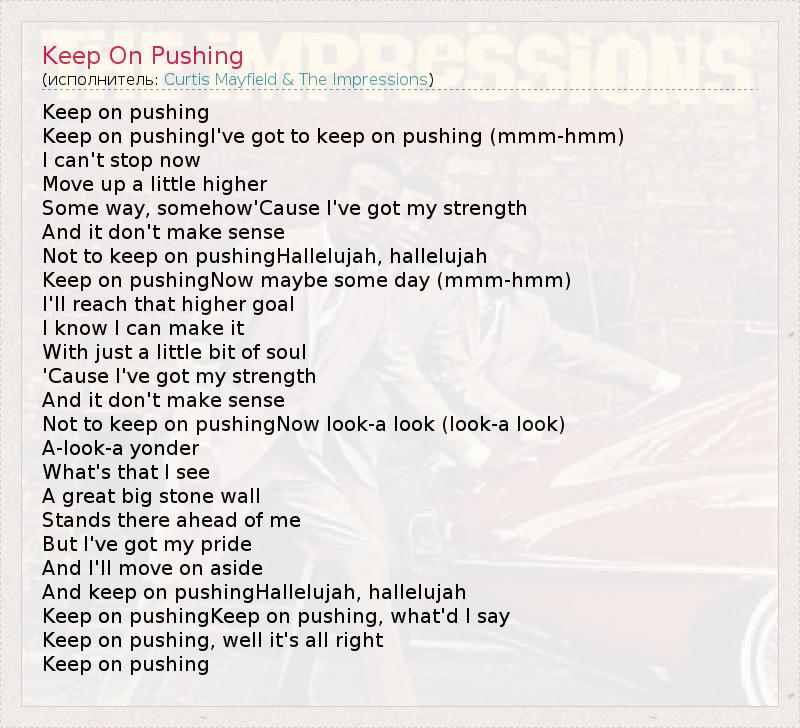 Keep on pushing Keep on pushingI've got to keep on pushing (mmm-hmm) I can't stop now Move up a little higher Some way, somehow'Cause I've got my strength And it don't make sense Not to keep on pushingHallelujah, hallelujah Keep on pushingNow maybe some day (mmm-hmm) I'll reach that higher goal I know I can make it With just a little bit of soul 'Cause I've got my strength And it don't make sense Not to keep on pushingNow look-a look (look-a look) A-look-a yonder What's that I see A great big stone wall Stands there ahead of me But I've got my pride And I'll move on aside And keep on pushingHallelujah, hallelujah Keep on pushingKeep on pushing, what'd I say Keep on pushing, well it's all right Keep on pushing