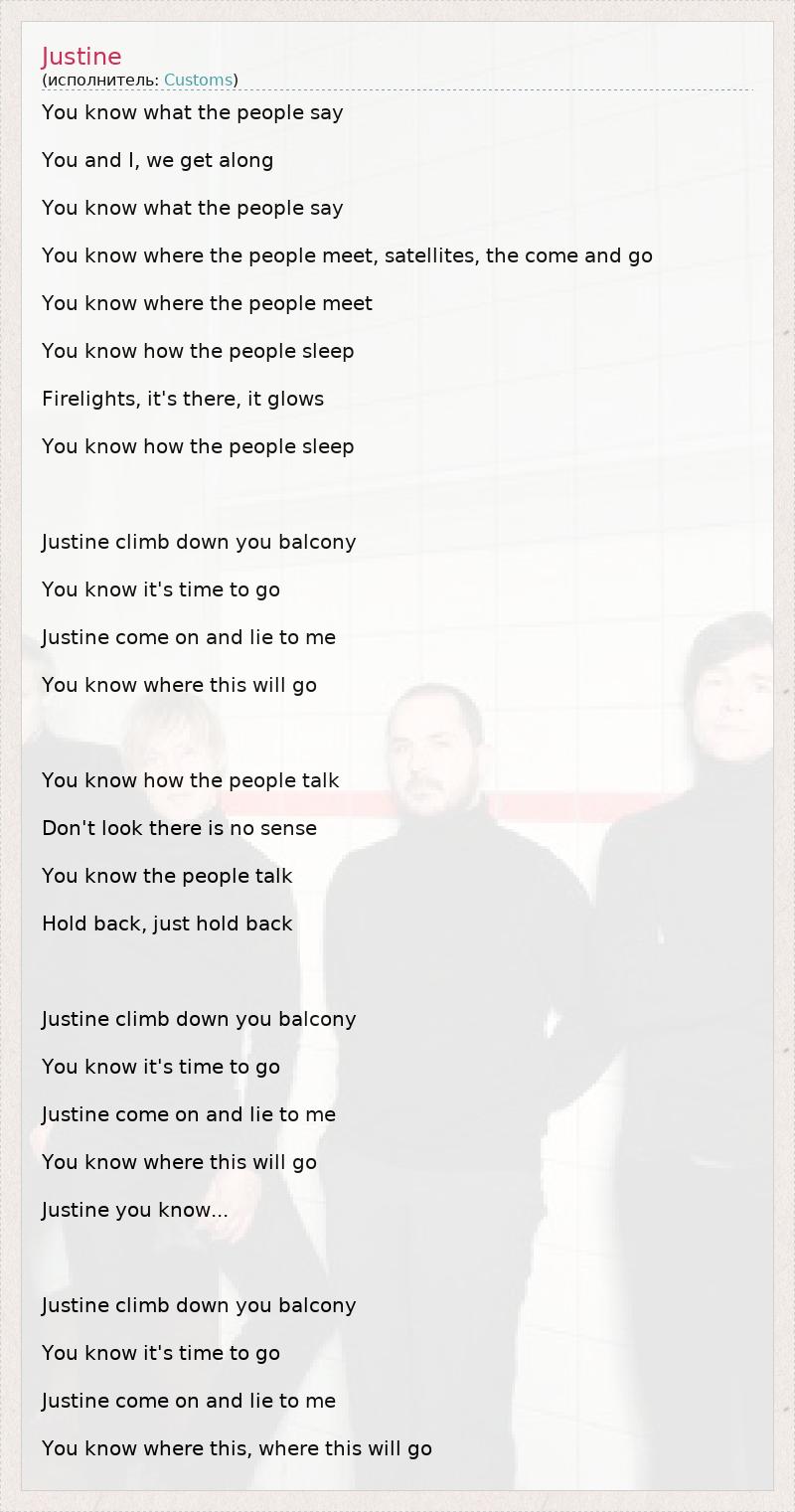 You know what the people say You and I, we get along You know what the people say You know where the people meet, satellites, the come and go You know where the people meet You know how the people sleep Firelights, it's there, it glows You know how the people sleep Justine climb down you balcony You know it's time to go Justine come on and lie to me You know where this will go You know how the people talk Don't look there is no sense You know the people talk Hold back, just hold back Justine climb down you balcony You know it's time to go Justine come on and lie to me You know where this will go Justine you know... Justine climb down you balcony You know it's time to go Justine come on and lie to me You know where this, where this will go
